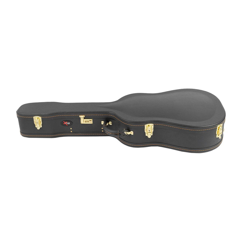 Suits Dreadnought, Western, Steel String and 12 String acoustic guitars. Heavy duty plywood covered in black vinyl with orange stitching . Arched top. Thick foam interior padding. Black plush lined with fitted black protective internal blanket. Covered accessory compartment. Ergonomic imitation leather handle. 4 deluxe gold drawbolt latches and combination lock. Lock can be set to any 3 digit number. Xtreme logo plate.