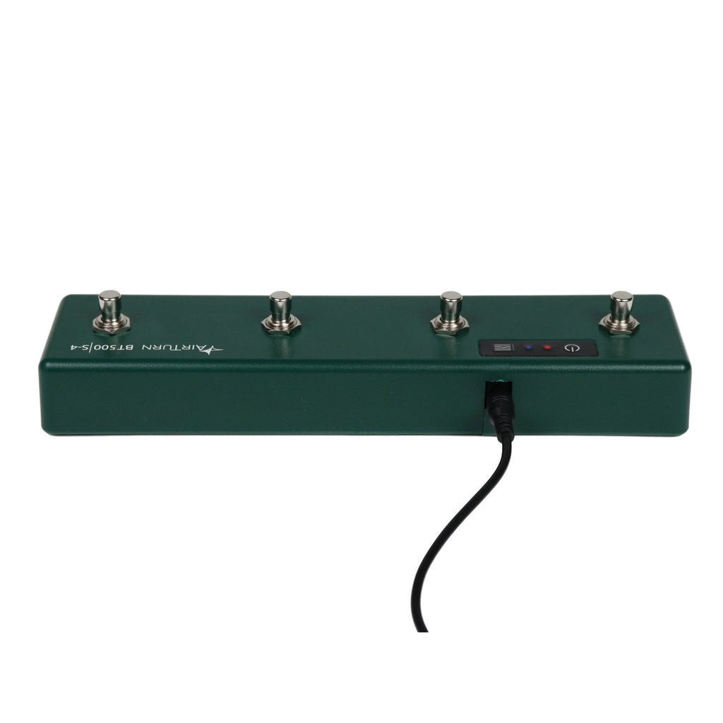 Featuring a durable stompbox design and complete with quiet steel switches, the AirTurn BT500S-4 easily integrates into a pedal board setup and is powered by a rechargeable battery or optional 9v power supply.