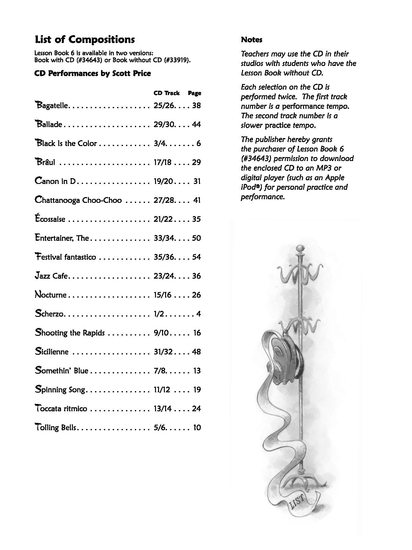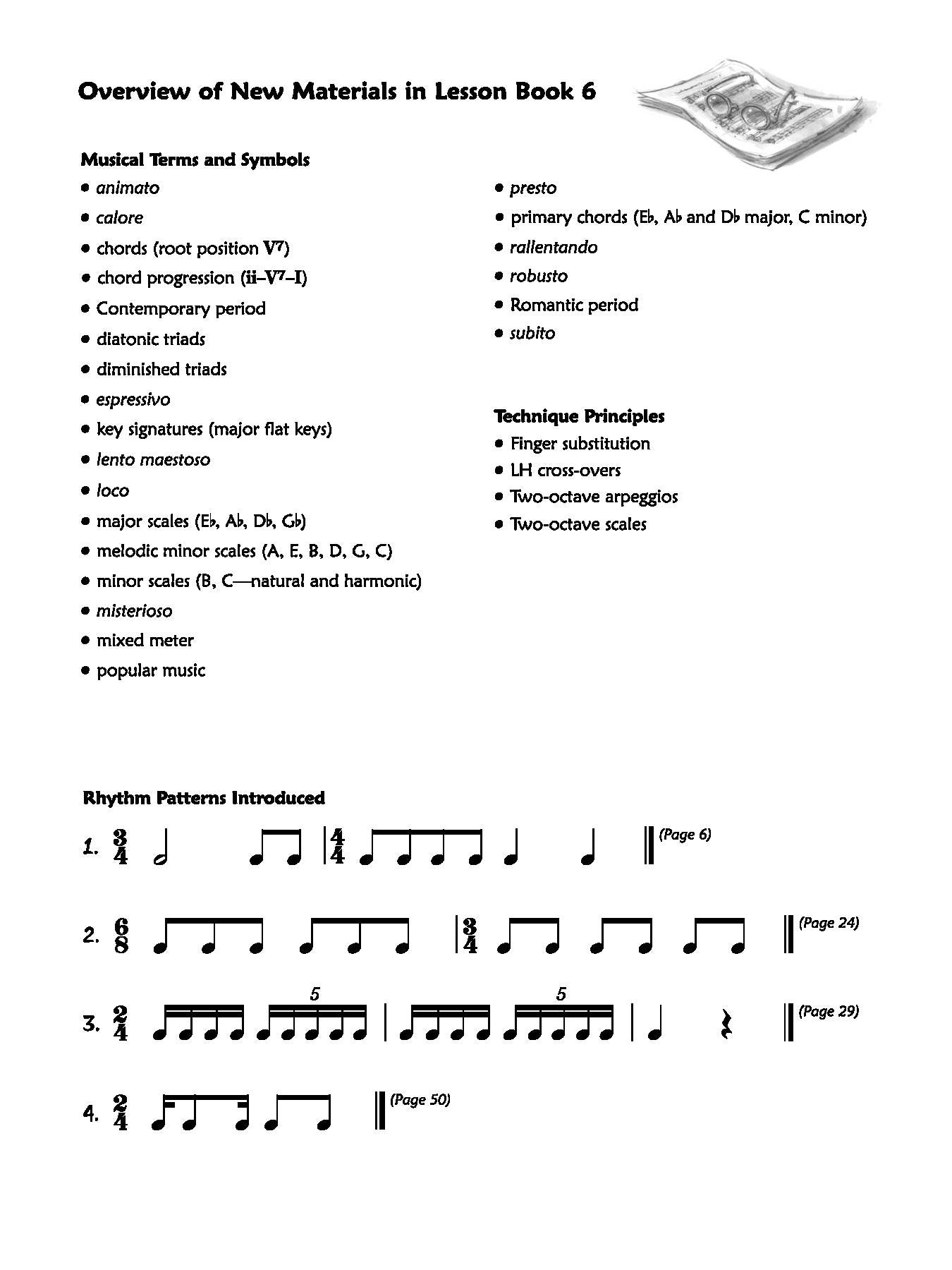Premier Piano Course Level 6 lets students develop their rhythm skills using mixed meter. A special focus is a stylistic introduction to the Romantic and Contemporary masterworks, as well as popular music. Additional pieces range from lyrical ballads and jazz styles to arrangements of familiar classic and folk themes. New concepts introduced include diminished triads, the ii-V7-I chord progression, and additional scales and keys. Each piece on the CD was recorded at a performance tempo and a slower practice tempo.