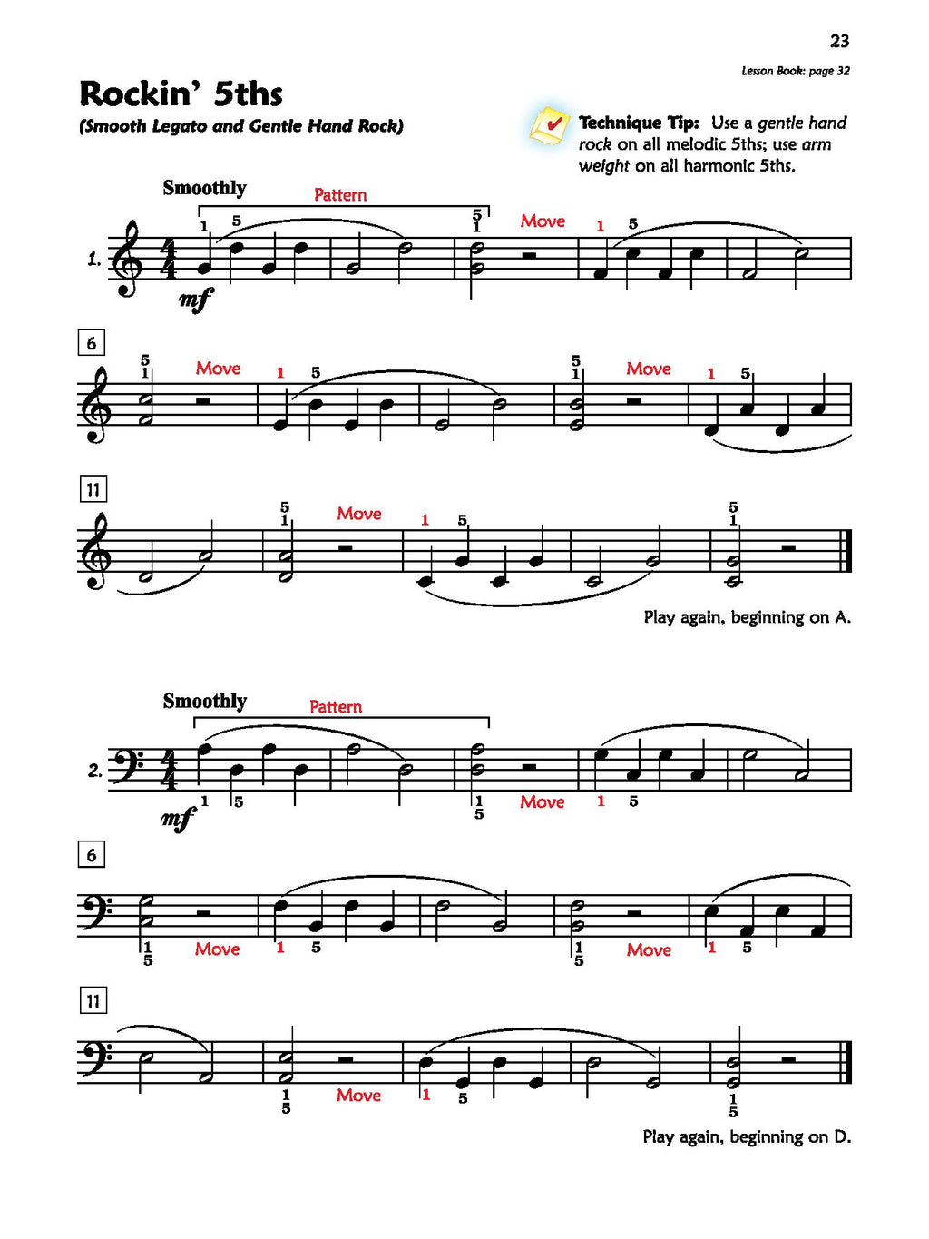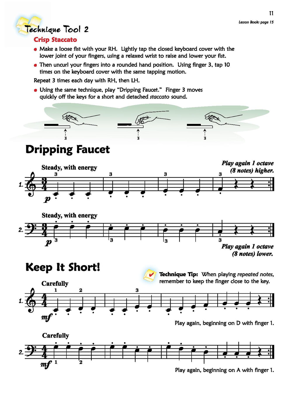 The technical tools and artistic skills learned in Technique 1A are enhanced and expanded in Technique 1B. Four new technique tools are introduced that relate to smooth legato, crisp staccato, rising wrist and amazing phrasing. Patterned exercises provide repetitions that make technique feel natural and artistic etudes showcase a student’s technique in an expressive musical setting. New to this level are Hands-Together Workshops that focus on developing the skills necessary for coordinating hands-together playing. Each page in the Technique Book correlates with a specific page in the Lesson Book.