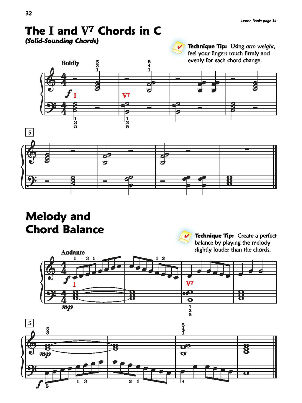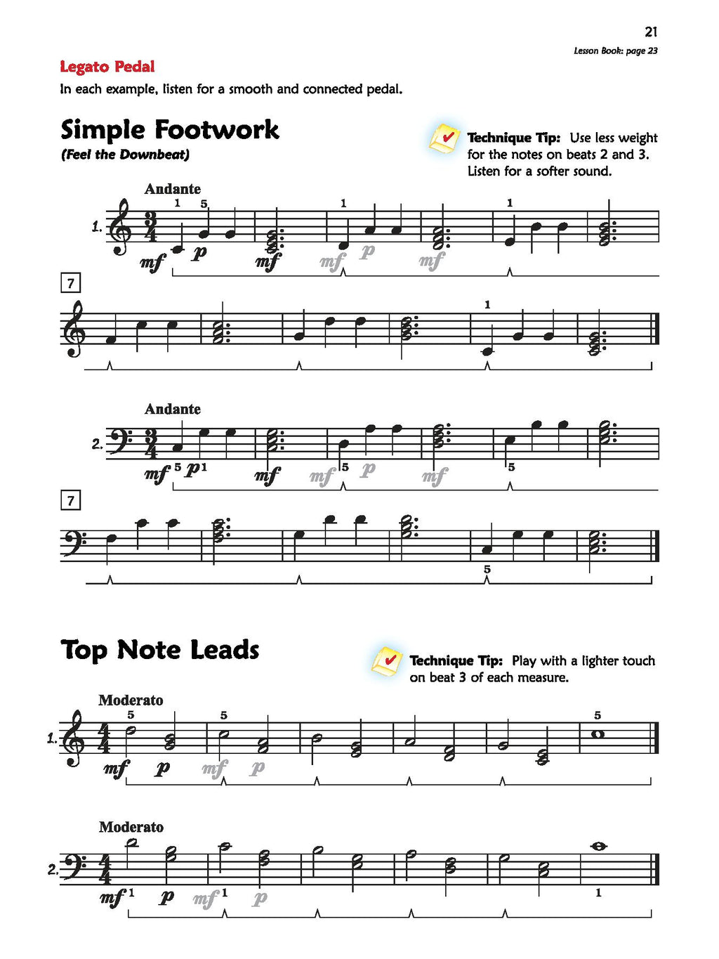 Technique 2B continues and expands on the technical and artistic tools learned in Technique books 1A, 1B, and 2A. The seven new Technique Tools introduced are: three-note slurs, preparing quickly for hand crossings, feel the downbeat, finger stretches, legato pedal, finger 1 under finger 3, and finger 3 over finger 1. Artistic Etudes showcase a student’s technique in an expressive musical setting, and Hands-Together Workshops focus on developing the skills necessary for coordinating hands-together playing. Masterwork etudes provide training to play standard masterworks. Each page in the Technique Book correlates with a specific page in the Lesson Book.