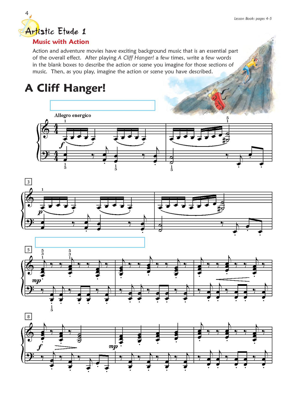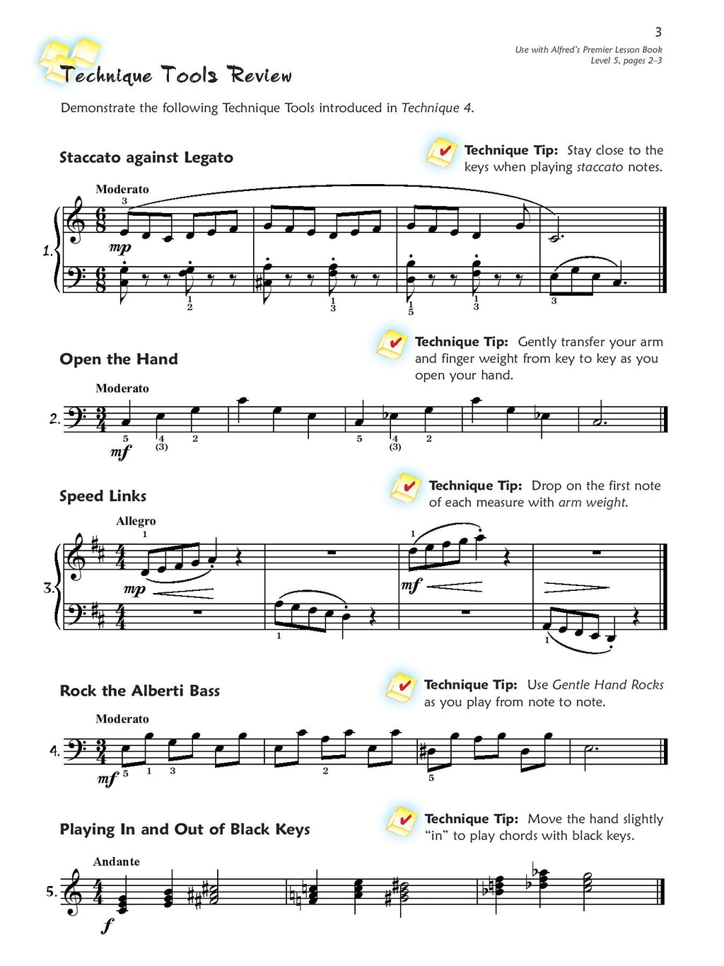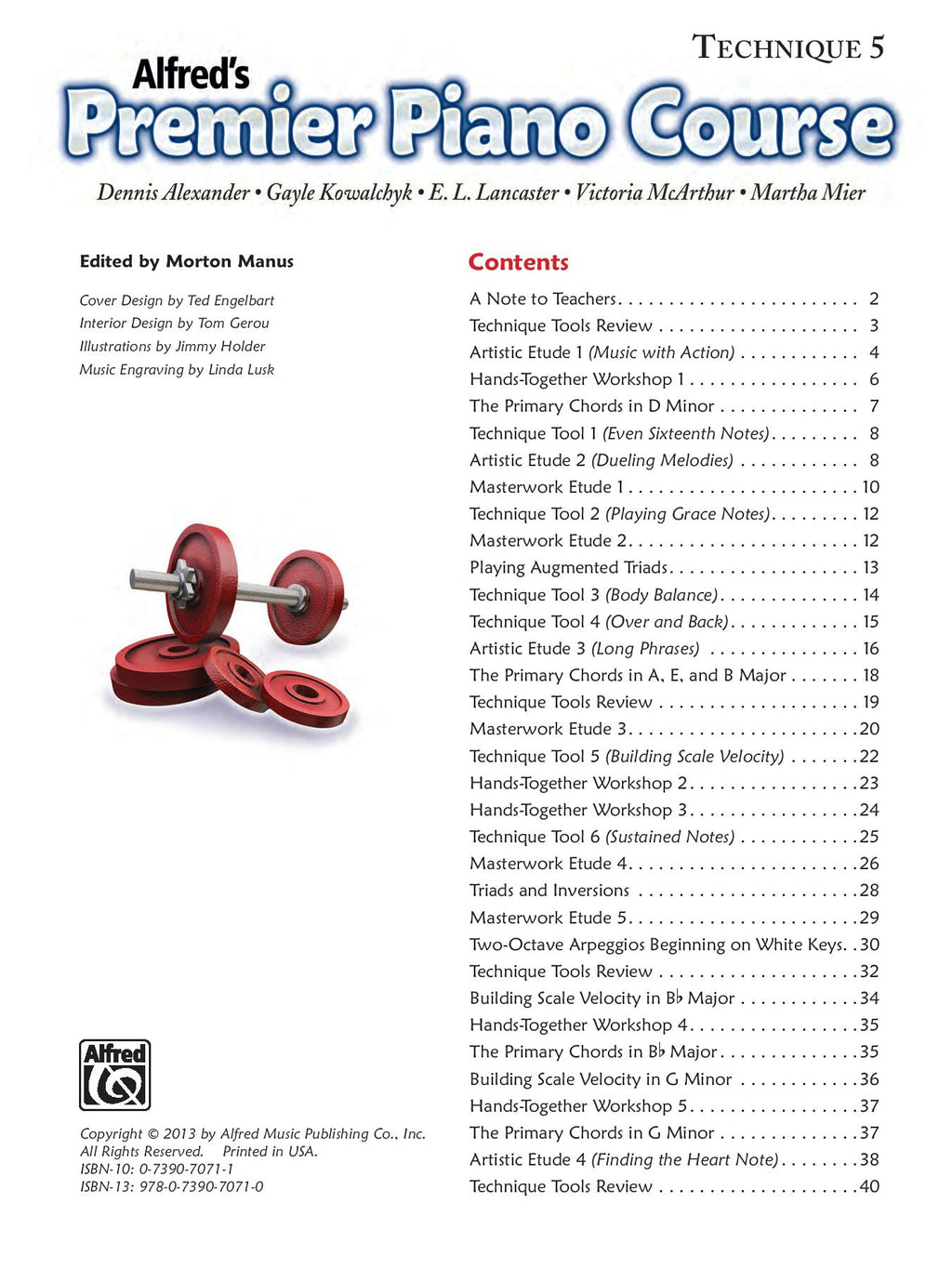 Technique 5 continues and expands on the technical and artistic tools learned in Technique books 1A--4. The six new Technique Tools introduced are: Even Sixteenth Notes, Playing Grace Notes, Body Balance, Over and Back, Building Scale Velocity, and Sustained Notes. Artistic Etudes showcase a student's technique in an expressive musical setting, and Hands-Together Workshops focus on developing the skills necessary for coordinating hands-together playing. Masterwork Etudes provide training to play standard masterworks. Each page in the Technique Book correlates with a specific page in the Lesson Book.