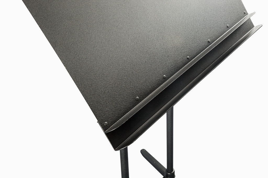 This stand contains a sturdy base with double legs, and accommodates full-sized scores, writing/editing implements and conductor’s batons.
