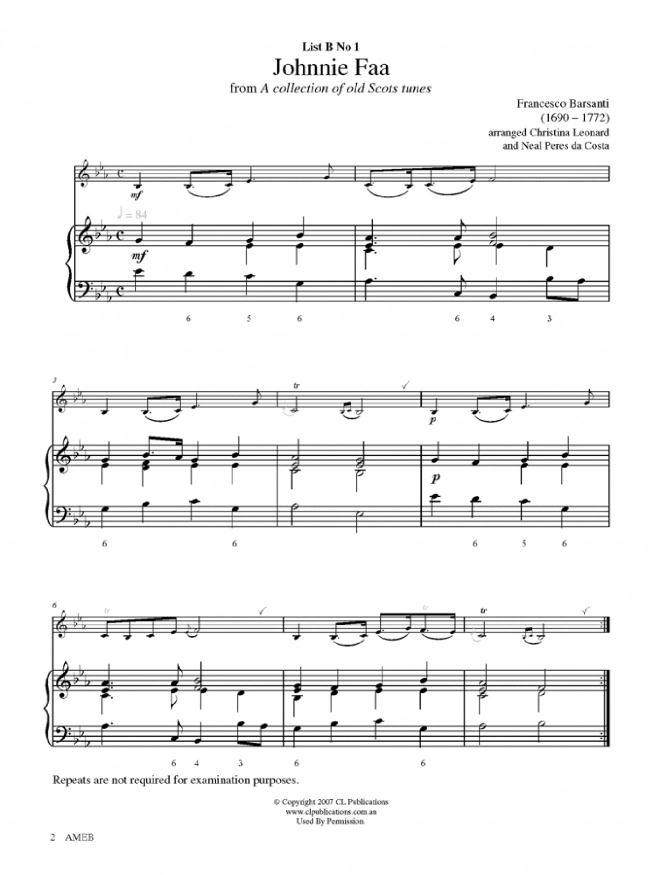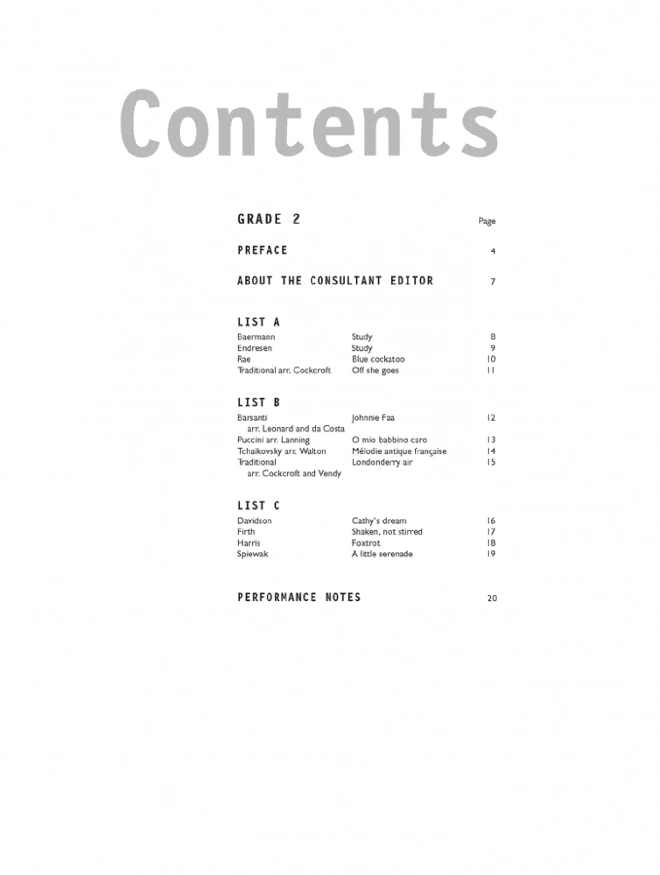 Study (Baermann) ♫ Study (Endresen) ♫ Blue cockatoo (Rae) ♫ Off she goes (Traditional arr. Cockcroft) ♫ Johnnie Faa (Barsanti arr. Leonard and da Costa) ♫ O mio babbino caro (Puccini arr. Lanning) ♫ Mélodie antique française (Tchaikovsky arr. Walton) ♫ Londonderry air (Traditional arr. Cockcroft and Vendy) ♫ Cathy's dream (Davidson) ♫ Shaken, not stirred (Firth) ♫ Foxtrot (Harris) ♫ A little serenade (Spiewak) + Performance Notes
