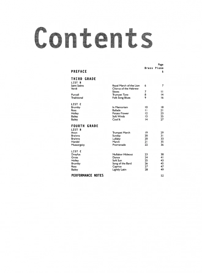 Royal March of the Lion (Saint-Saëns) ♫ Chorus of the Hebrew Slaves (Verdi) ♫ Trumpet Tune (Purcell) ♫ Folk Song Blues (Traditional) ♫ In Memoriam (Brumby) ♫ Ballade (Ross) ♫ Potato Flower (Holley) ♫ Soft Winds (Bailey) ♫ Cool It (Bailey) ♫ Trumpet March (Anon) ♫ Sunday (Brahms) ♫ Lullaby (Brahms) ♫ March (Handel) ♫ Promenade (Mussorgsky) ♫ Nullabor Hideout (Dreyfus) ♫ Dance (Gross) ♫ Soft Sun (Holley) ♫ Song of the Bard (Brumby) ♫ Caprice (Ross) ♫ Lightly Latin (Bailey) + Performance Notes