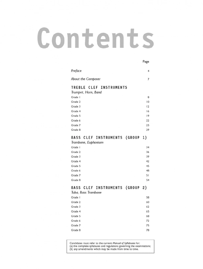 A structured course in the development of sight-reading for Brass containing examples of the kind of sight-reading material candidates may encounter in examinations from First Grade to Eighth Grade.