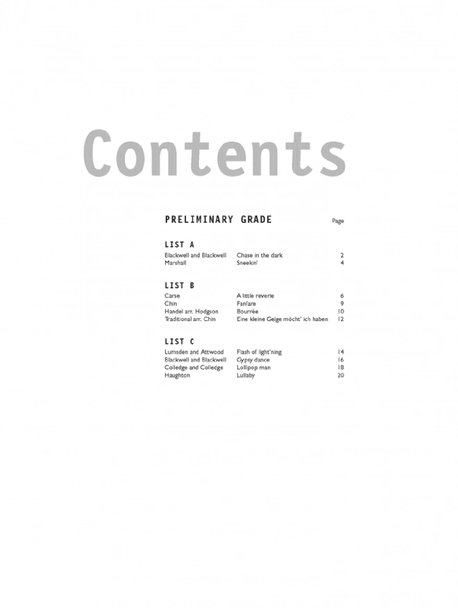 Chase in the dark (Blackwell and Blackwell) ♫ I am the captain of a pirate ship (Hewitt-Jones) ♫ The clown (Legg) ♫ Sneekin' (Marshall) ♫ A little reverie (Carse) ♫ Fanfare (Chin) ♫ Bourrée (Handel arr. Hodgson) ♫ Eine kleine Geige möcht' ich haben (Traditional arr. Chin) ♫ Flash of light'ning (Lumsden and Attwood) ♫ Gypsy dance (Blackwell and Blackwell) ♫ Lollipop man (Colledge and Colledge) ♫ Lullaby (Haughton) + Performance Notes