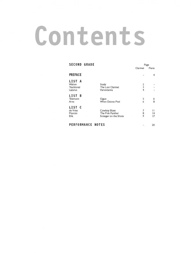 Study (Walton) ♫ The Lost Clarinet (Traditional) ♫ Varsovianna (Lazarus) ♫ Gigue (Telemann) ♫ When Daisies Pied (Arne) ♫ Cowboy Blues (de Vries) ♫ The Pink Panther (Mancini) ♫ Stranger on the Shore (Bilk) + Performance Notes