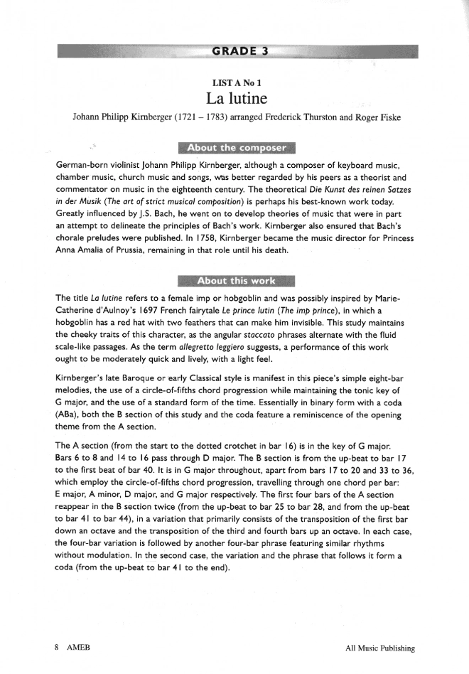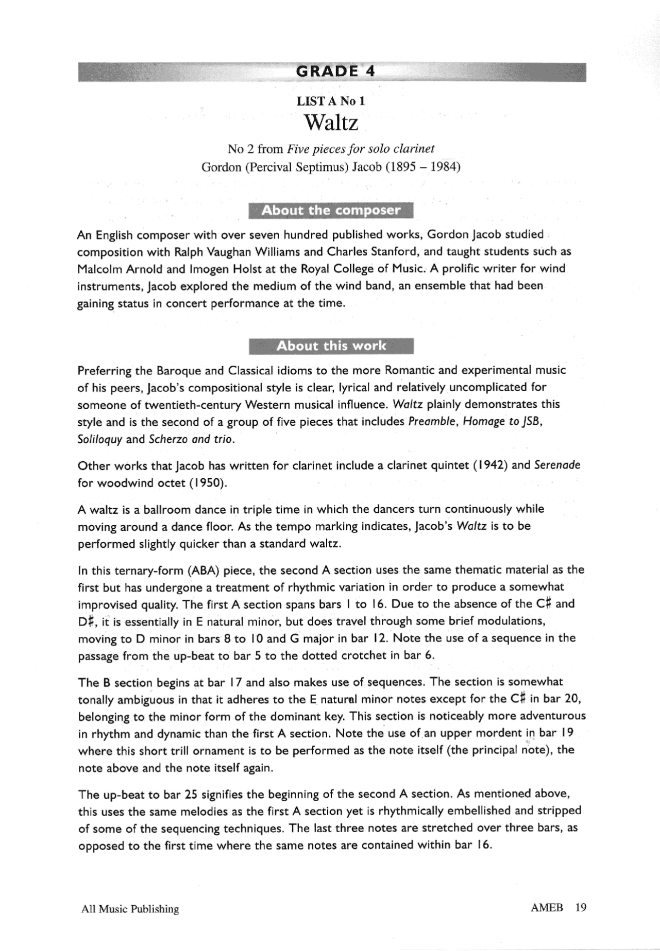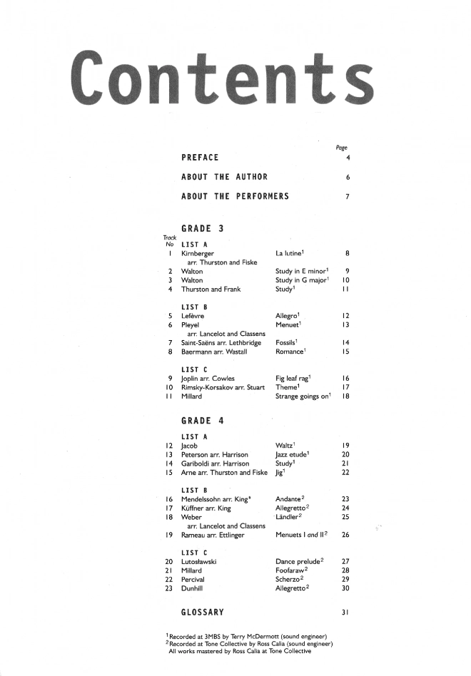 La lutine (Kirnberger arr. Thurston and Fiske ♫ Study in E minor (Walton) ♫ Study in G minor (Walton) ♫ Study (Thurston and Frank) ♫ Allegro (Lefévre) ♫ Menuet (Pleyel arr. Lancelot and Classens) ♫ Fossils (Saint-Saëns arr. Lethbridge) ♫ Romance (Baermann arr. Wastall) ♫ Fig leaf rag (Joplin arr. Cowles) ♫ Theme (Rimsky-Korsakov arr. Stuart) ♫ Strange goings on (Millard) ♫ Waltz (Jacob) ♫ Jazz etude (Peterson arr. Harrison) ♫ Study (Gariboldi arr. Harrison) ♫ Jig (Arne arr. Thurston and Fiske) ♫ Andante (Mendelssohn arr. King) ♫ Allegretto (Küffner arr. King) ♫ Ländler (Weber arr. Lancelot and Classens) ♫ Menuets I and II (Rameau arr. Ettlinger) ♫ Dance Prelude (Lutosławski) ♫ Foofaraw (Millard) ♫ Scherzo (Percival) ♫ Allegretto (Dunhill)
