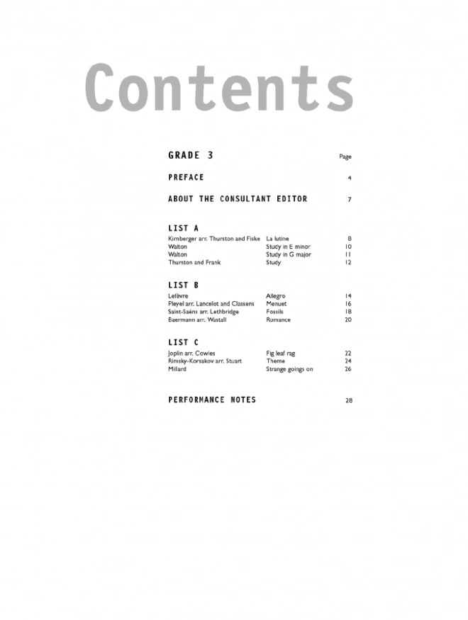 La lutine (Kirnberger arr. Thurston and Fiske) ♫ Study in E minor (Walton) ♫ Study in G minor (Walton) ♫ Study (Thurston and Frank) ♫ Allegro (Lefévre) ♫ Menuet (Pleyel arr. Lancelot and Classens) ♫ Fossils (Saint-Saëns arr. Lethbridge) ♫ Romance (Baermann arr. Wastall) ♫ Fig leaf rag (Joplin arr. Cowles) ♫ Theme (Rimsky-Korsakov arr. Stuart) ♫ Strange goings on (Millard) + Performance Notes