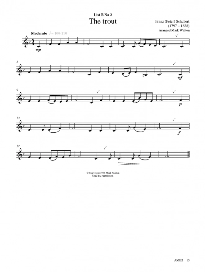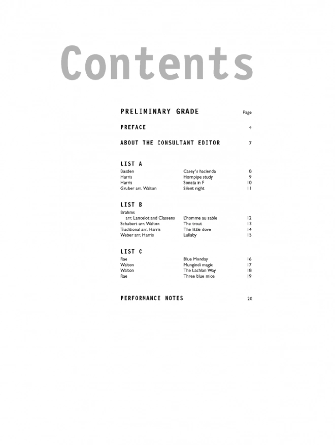 Casey's hacienda (Basden) ♫ Hornpipe study (Harris) ♫ Sonata in F (Harris) ♫ Silent night (Gruber arr. Walton) ♫ L'homme au sable (Brahms arr. Lancelot and Classens) ♫ The trout (Schubert arr. Walton) ♫ The little dove (Traditional arr. Harris) ♫ Lullaby (Weber arr. Harris) ♫ Blue Monday (Rae) ♫ Mungindi magic (Walton) ♫ The Lachlan Way (Walton) ♫ Three blue mice (Rae) + Performance Notes