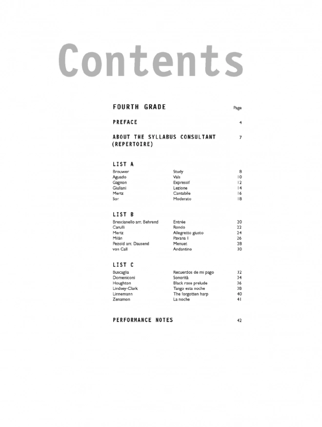 Study (Brouwer) ♫ Vals (Aguado) ♫ Expressif (Gagnon) ♫ Lezione (Giuliani) ♫ Cantabile (Mertz) ♫ Moderato (Sor) ♫ Entrée (Brescianello arr. Behrend) ♫ Rondo (Carulli) ♫ Allegretto giusto (Mertz) ♫ Pavana I (Milán) ♫ Menuet (Pezold arr. Dausend) ♫ Andantino (von Call) ♫ Recuerdos de mi pago (Buscaglia) ♫ Sonorità (Domeniconi) ♫ Black rose prelude (Houghton) ♫ Tango esta noche (Lindsey-Clark) ♫ The forgotten harp (Linnemann) ♫ La noche (Zenamon) + Performance Notes