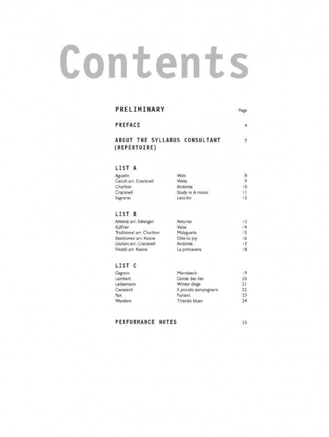 Wals (Aguado) ♫ Waltz (Carulli arr. Cracknell) ♫ Andante (Charlton) ♫ Study in A minor (Cracknell) ♫ Lección (Sagreras) ♫ Asturias (Albéniz arr. Bélanger) ♫ Valse (Küffner) ♫ Malagueña (Traditional arr. Charlton) ♫ Ode to Joy (Beethoven arr. Keane) ♫ Andante (Giuliani arr. Cracknell) ♫ La primavera (Vivaldi arr. Keane) ♫ Marrakech (Gagnon) ♫ Danse des îles (Lambert) ♫ Winter dirge (Letkemann) ♫ Il piccolo zampognaro (Cavazzoli) ♫ Furiant (Rak) ♫ Tirando blues (Wanders) + Performance Note