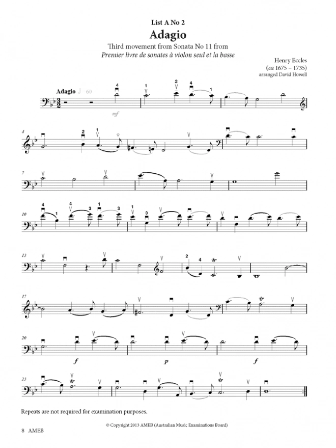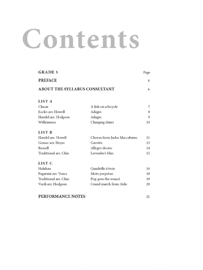 A fish on a bicycle (Clucas) ♫ Adagio (Eccles arr. Howell) ♫ Adagio (Handel arr. Hodgson) ♫ Charging rhino (Williamson) ♫ Chorus from Judas Maccabæus (Handel arr. Howell) ♫ Gavotte (Gossec arr. Heyes) ♫ Allegro deciso (Russel) ♫ Lavender's blue (Traditional arr. Chin) ♫ Quadrille à trois (Halahan) ♫ Moto perpetuo (Paganini arr. Vance) ♫ Pop goes the weasel (Traditional arr. Chin) ♫ Grand march from Aïda (Verdi arr. Hodgson)