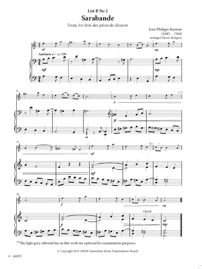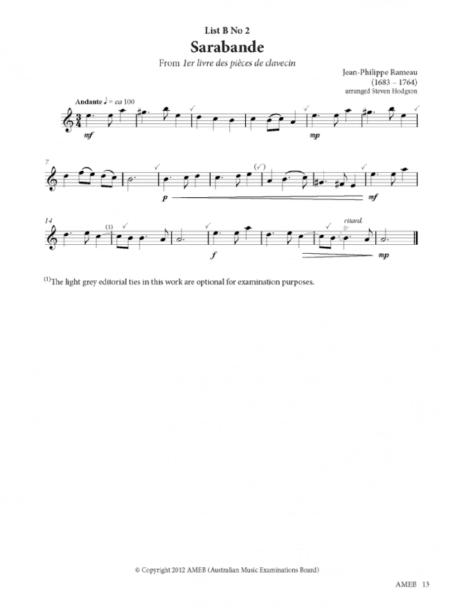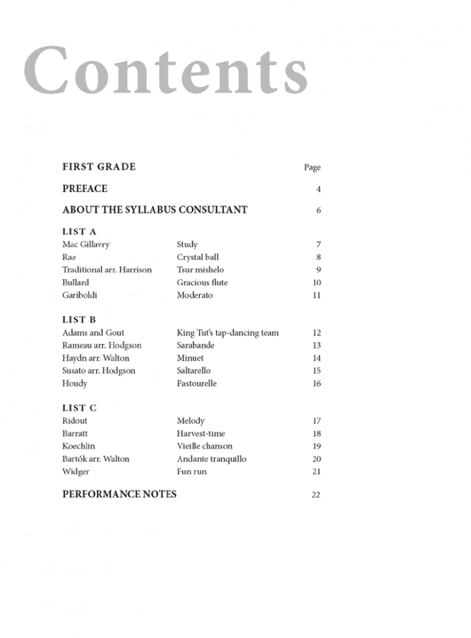 Study (Mac Gillavry) ♫ Crystal ball (Rae) ♫ Tsur mishelo (Traditional arr. Harrison) ♫ Gracious flute (Bullard) ♫ Moderato (Gariboldi) ♫ King Tut's tap-dancing team (Adams and Gout) ♫ Sarabande (Rameau arr. Hodgson) ♫ Minuet (Haydn arr. Walton) ♫ Saltarello (Susato arr. Hodgson) ♫ Pastourelle (Houdy) ♫ Melody (Ridout) ♫ Harvest-time (Barratt) ♫ Vielle chanson (Koechlin) ♫ Andante tranquillo (Bartók arr. Walton) ♫ Fun run (Widger) + Performance Notes