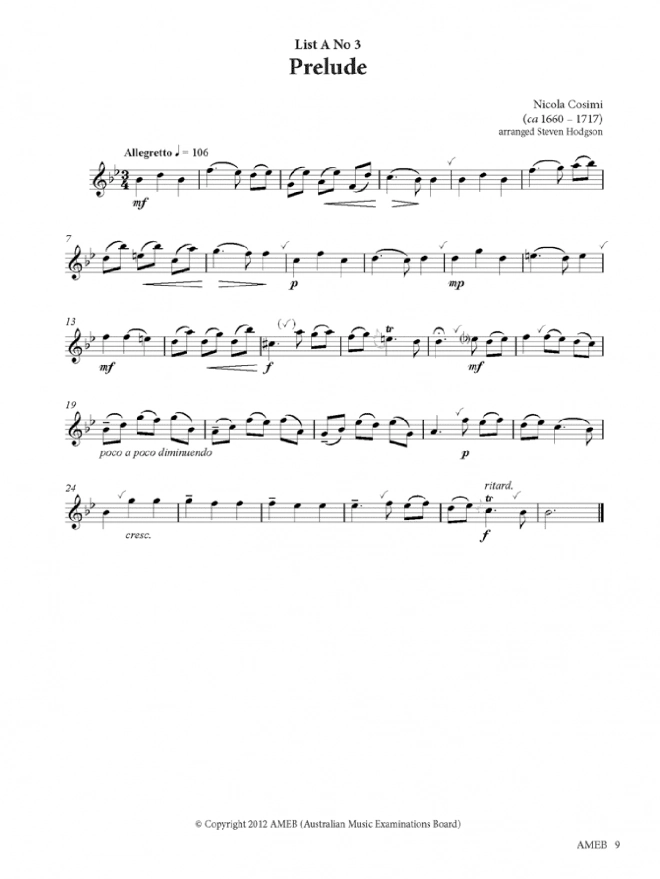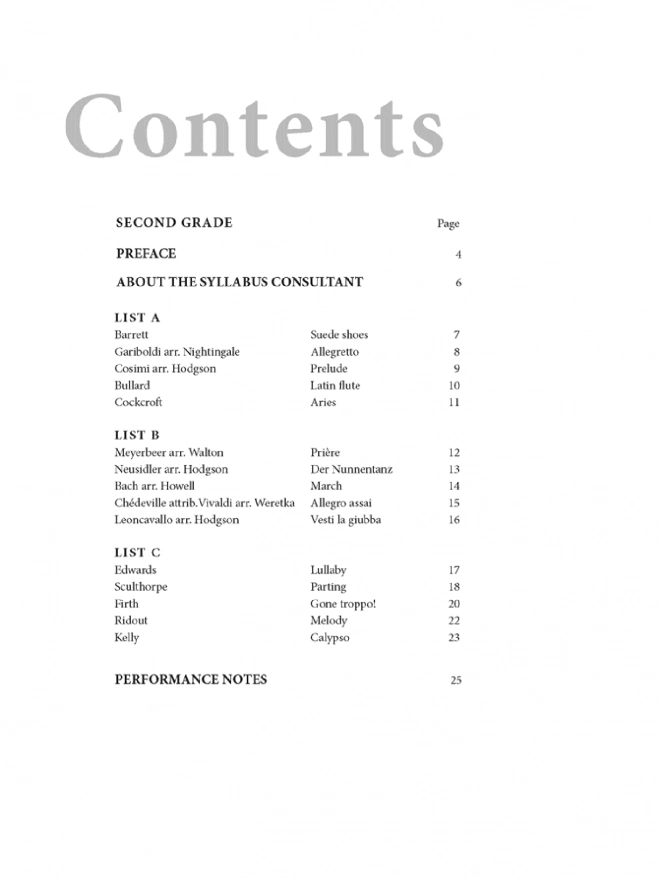 Suede shoes (Barrett) ♫ Allegretto (Gariboldi arr. Nightingale) ♫ Prelude (Cosimi arr. Hodgson) ♫ Latin flute (Bullard) ♫ Aries (Cockcroft) ♫ Priére (Meyerbeer arr. Walton) ♫ Der Nunnentanz (Neusidler arr. Hodgson) ♫ March (Bach arr. Howell) ♫ Allegro assai (Chédeville attrib. Vivaldi arr. Weretka) ♫ Vesti la giubba (Leoncavallo arr. Hodgson) ♫ Lullaby (Edwards) ♫ Parting (Sculthorpe) ♫ Gone troppo (Firth) ♫ Melody (Ridout) ♫ Calypso (Kelly) + Performance Notes