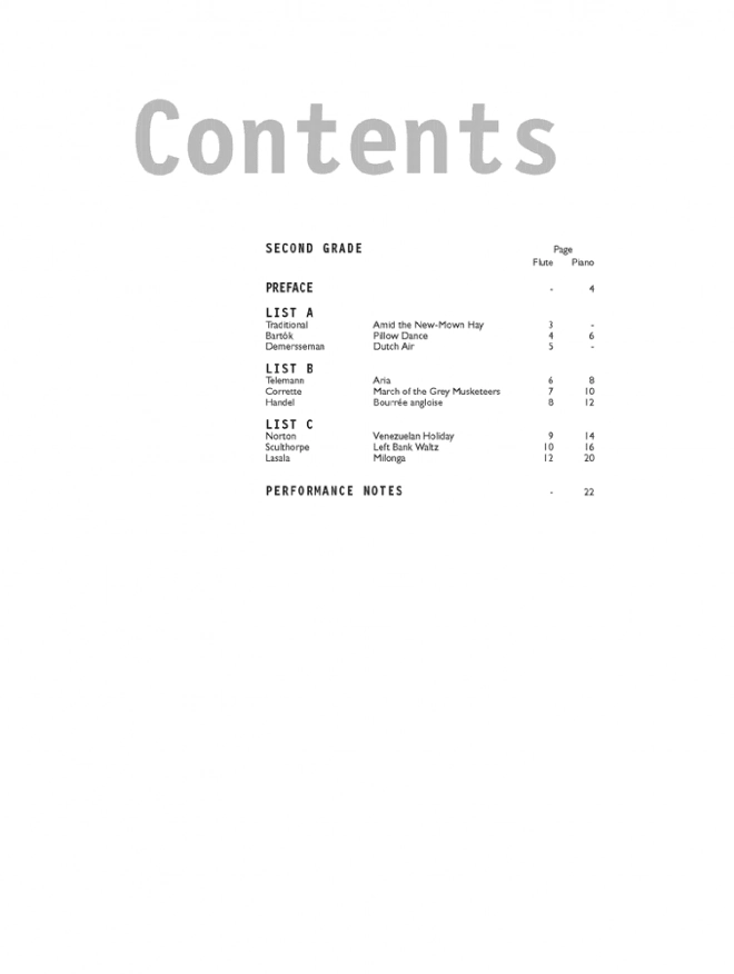 Amid the New-Mown Hay (Traditional) ♫ Pillow Dance (Bartók) ♫ Dutch air (Demersseman) ♫ Aria (Telemann) ♫ March of the Grey Musketeers (Corrette) ♫ Bourrée angloise (Handel) ♫ Venezuelan Holiday (Norton) ♫ Left Bank Waltz (Sculthorpe) ♫ Milonga (Lasala) + Performance Notes