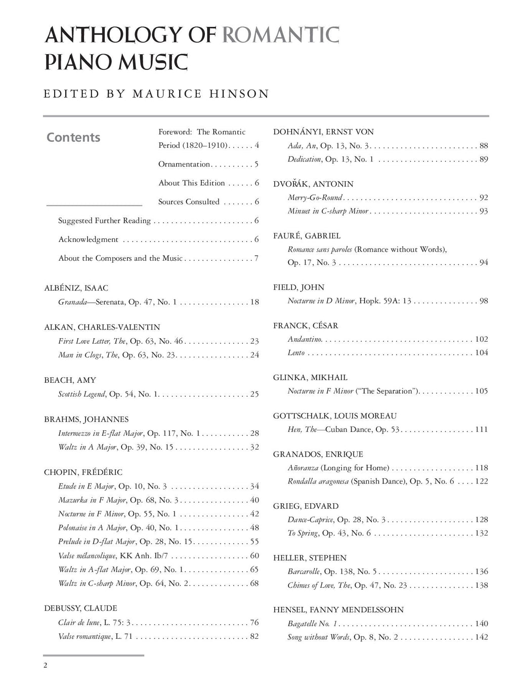 Works by 36 composers are included in this 248-page comprehensive survey of piano music written between 1820 and 1910. The pieces in this collection range in difficulty from intermediate through early-advanced levels and cover the widest range of styles and idioms of the Romantic period. The comb binding creates a lay-flat book that is perfect for study and performance. Historical and biographical background and performance notes are provided by Dr. Hinson.