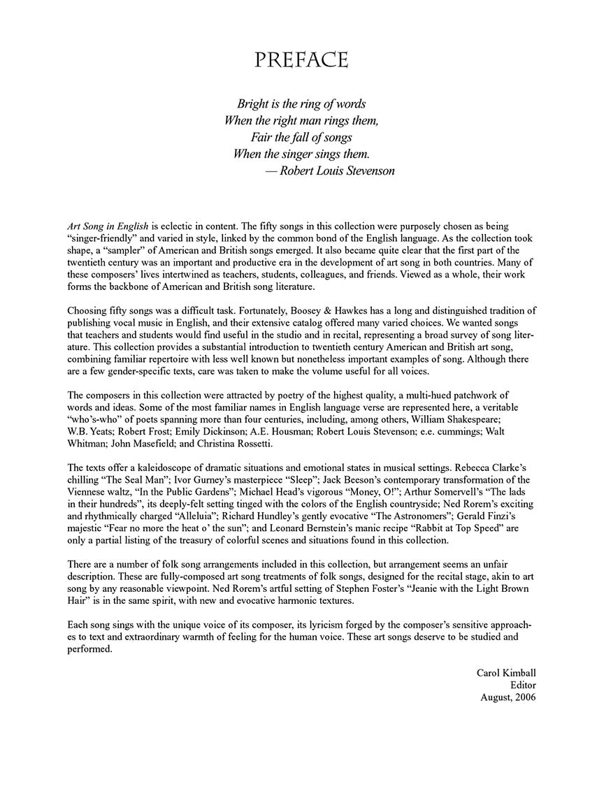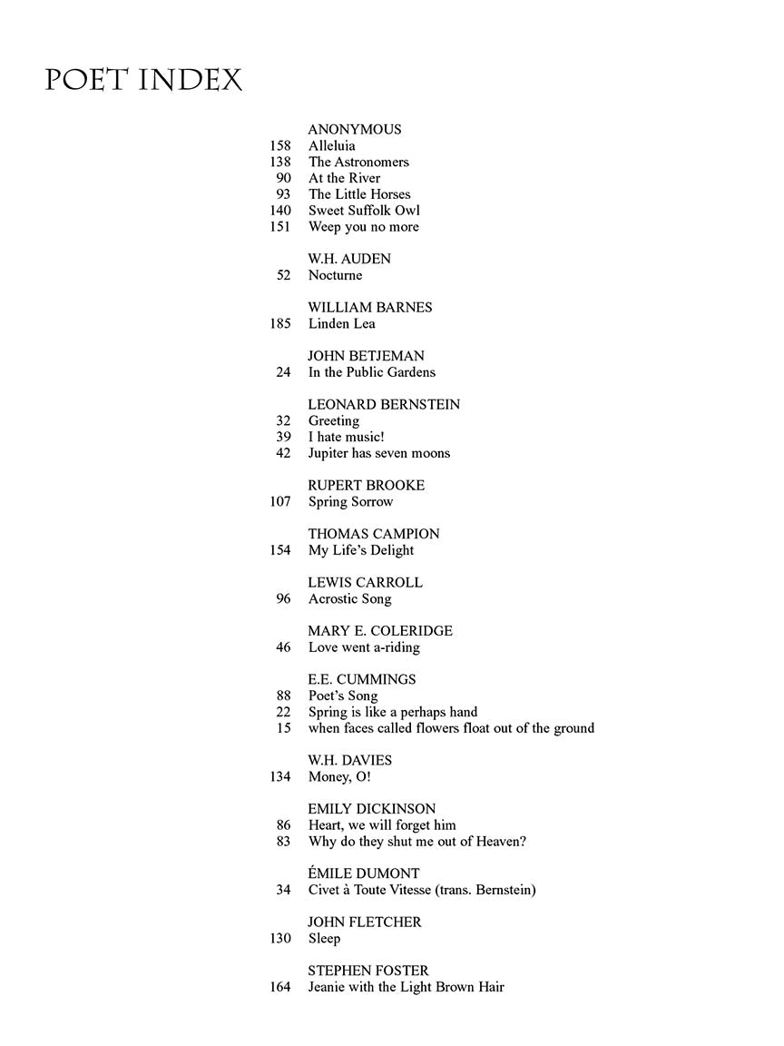 Contents: ARGENTO: Dirge • Spring • Spring Is Like a Perhaps Hand • When Faces Called Flowers Float out of the Ground • BEESON: In the Public Gardens • Indiana Homecoming • BERNSTEIN: Civet a Toute Vitesse (Rabbit at Top Speed) • Greeting • I Hate Music! • Jupiter has Seven Moons • BRIDGE: Love Went a-riding • BRITTEN: At the Mid Hour of Night • If it's ever spring again • Nocturne • The Salley Gardens • Sephestia's Lullaby • CHANLER: These, My Ophelia • CLARKE: Down by the Salley Gardens • The Seal Man • COPLAND: At the River • Heart, We Will Forget Him • The Little Horses • Poet's Song • Why Do They Shut Me Out of Heaven? • TREDICI: Acrostic Song • DUKE: Central Park at Dusk • There Will be Stars • FINZI: Fear No More the Heat o' the Sun • It Was a Lover and his Lass • Oh Fair to See • FLOYD: Two Stevenson Songs: Rain • Where Go the Boats? • GURNEY: Sleep • HEAD: Money, O! • HUNDLEY: The Astronomers • Sweet Suffolk Owl • Waterbird • IRELAND: Spring Sorrow • QUILTER: How Should I Your True Love Know? • My Life's Delight • Weep You No More • ROREM: Alleluia • Ferry Me Across the Water • Jeanie with the Light Brown Hair • Love • Stopping by Woods on a Snowy Evening • SOMERVELL: The Lads in Their Hundreds • VAUGHAN WILLIAMS: Bright Is the Ring of Words • Linden Lea • WARLOCK: Take, O Take Those Lips Away