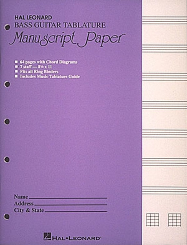 64-page stitched book; 8 1/2″ x 11″; seven 4-line staves on each page; 8 blank chord diagrams printed at bottom each page; punched to fit all ring binders; contains Music Tablature Guide