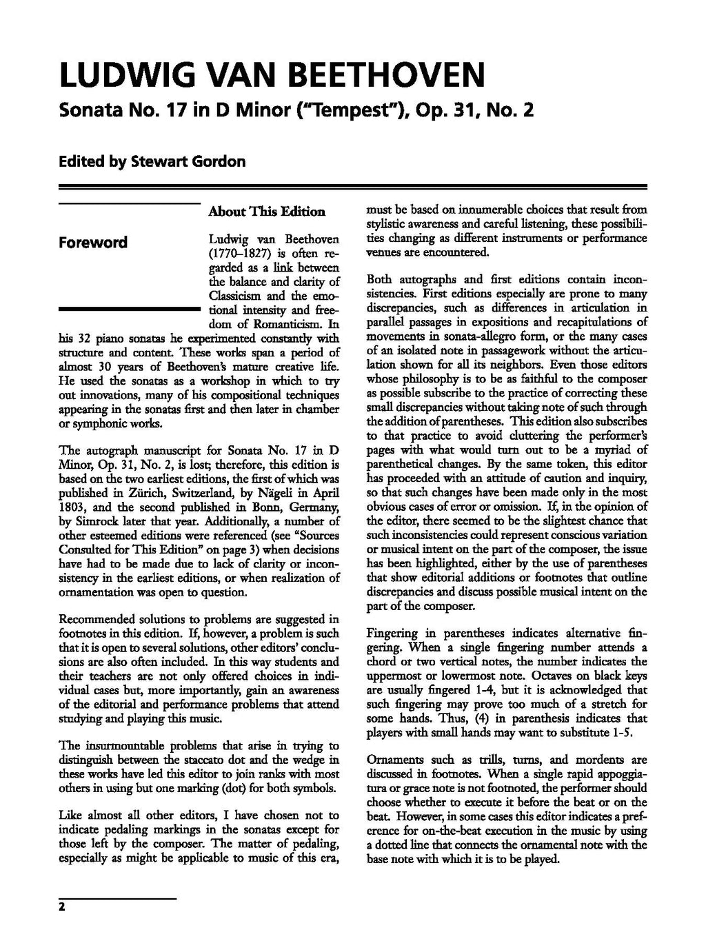 For Sonata No. 17 in D Minor, Op. 31, No. 2, the nickname "tempest" might refer to Shakespeare's classic play of the same title, although that has not been proven. Still, "tempest" has become firmly rooted as the nickname, describing the exciting "tempestuous" character of one of Beethoven's most famous sonatas. Dr. Stewart Gordon's editions of Beethoven's most popular piano sonatas provide the key to a stylistic performance. Thorough research of the earliest available sources has enabled Dr. Gordon to produce the most accurate reflection of the composer's intent. Each sonata contains helpful fingering suggestions and performance recommendations. Other editors' conclusions are noted where performance options are open to interpretation.