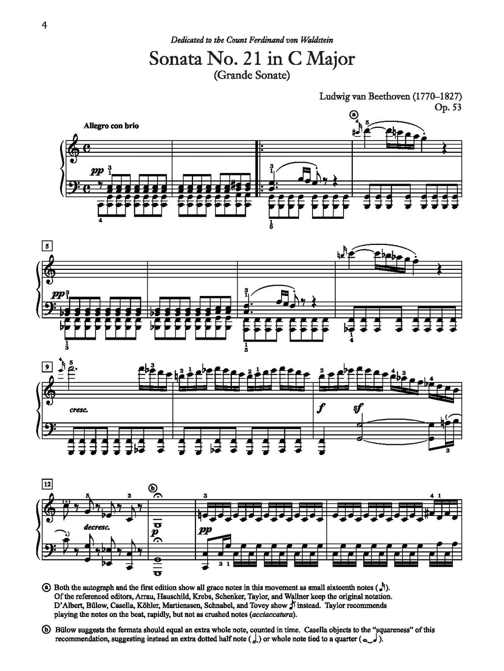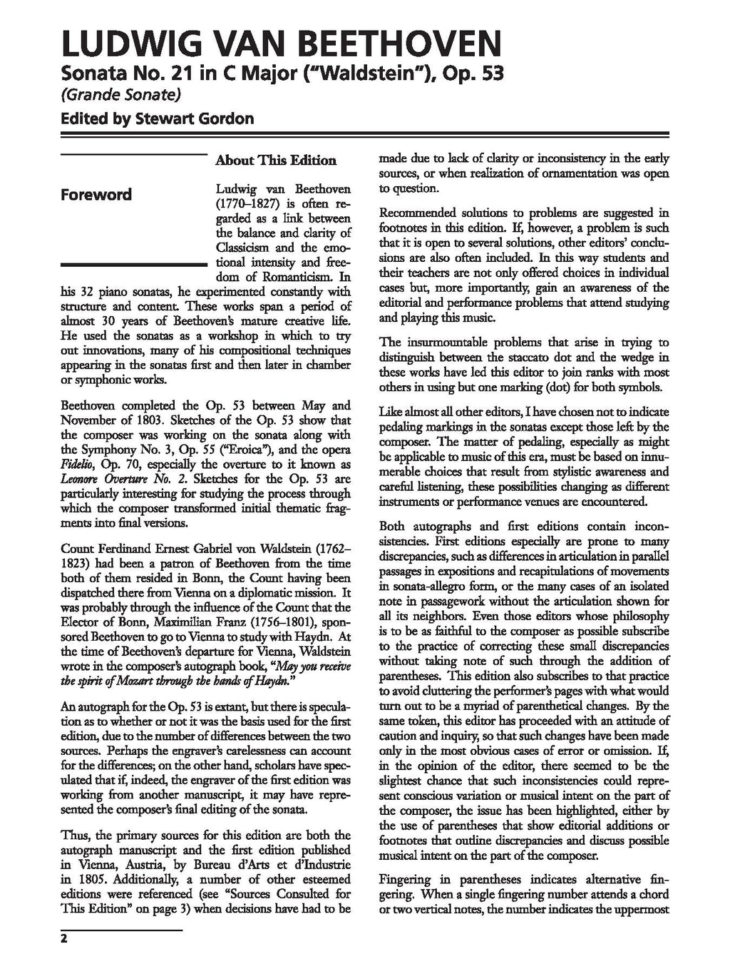Count Ferdinand Ernest Gabriel von Waldstein, to whom the Sonata No. 21 in C Major, Op. 53, is dedicated, was a longtime patron of the composer. Waldstein wrote to Beethoven, "May you receive the spirit of Mozart through the hands of Haydn." The opening theme of repeated chords begins the excitement found throughout this work. Dr. Stewart Gordon's editions of Beethoven's most popular piano sonatas provide the key to a stylistic performance. Thorough research of the earliest available sources has enabled Dr. Gordon to produce the most accurate reflection of the composer's intent. Each sonata contains helpful fingering suggestions and performance recommendations. Other editors' conclusions are noted where performance options are open to interpretation.