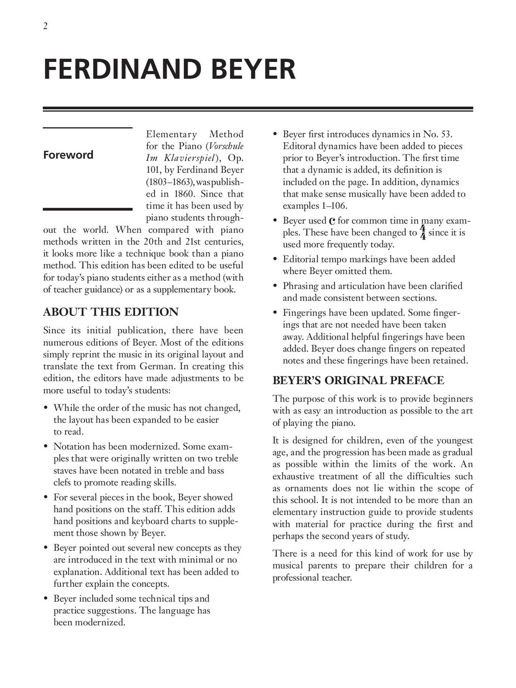 Vorschule Im Klavierspiel, Op. 101, by Ferdinand Beyer (1803--1863) was first published in 1860. Since that time, it has been used by piano students throughout the world, especially in Asian countries. When compared with piano methods written in the 20th and 21st centuries, it appears more like a technique book than a piano method. This edition has been edited to be useful for today's piano students, either as a method (with teacher guidance) or as a supplementary book.