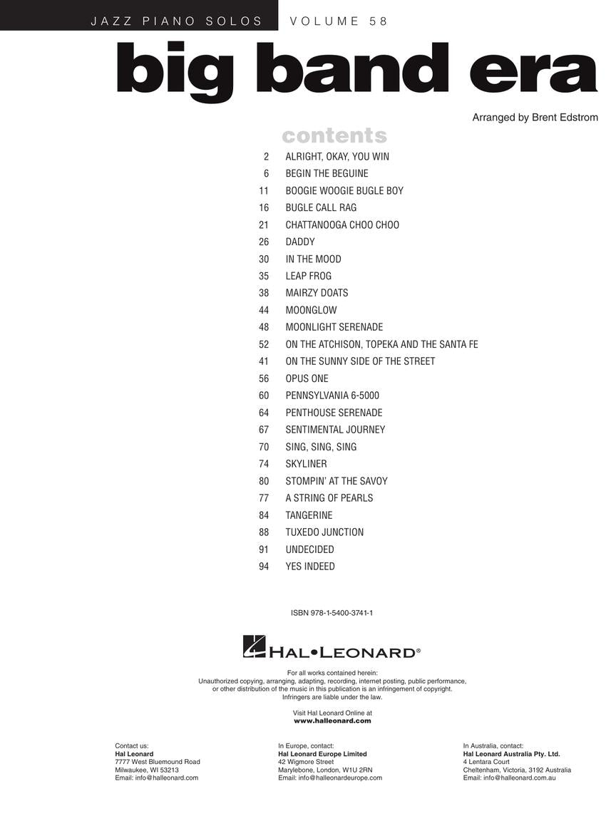 25 swinging tunes in piano solo arrangements with chord symbols, including: Boogie Woogie Bugle Boy • In the Mood • Opus One • Pennsylvania 6-5000 • Sing, Sing, Sing • Stompin' at the Savoy • A String of Pearls • Yes Indeed • and more.