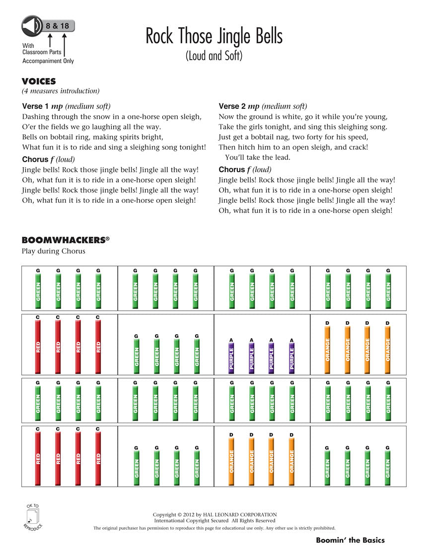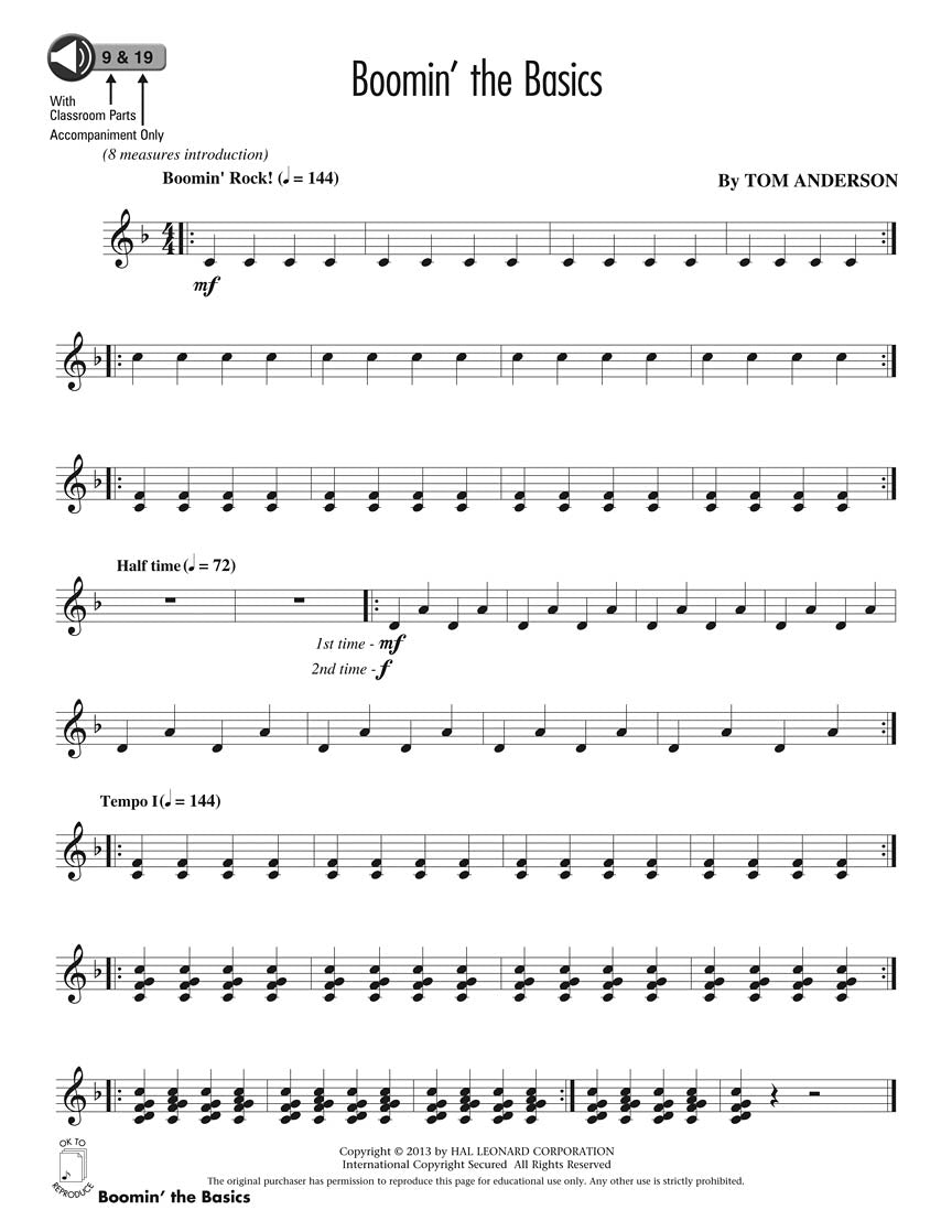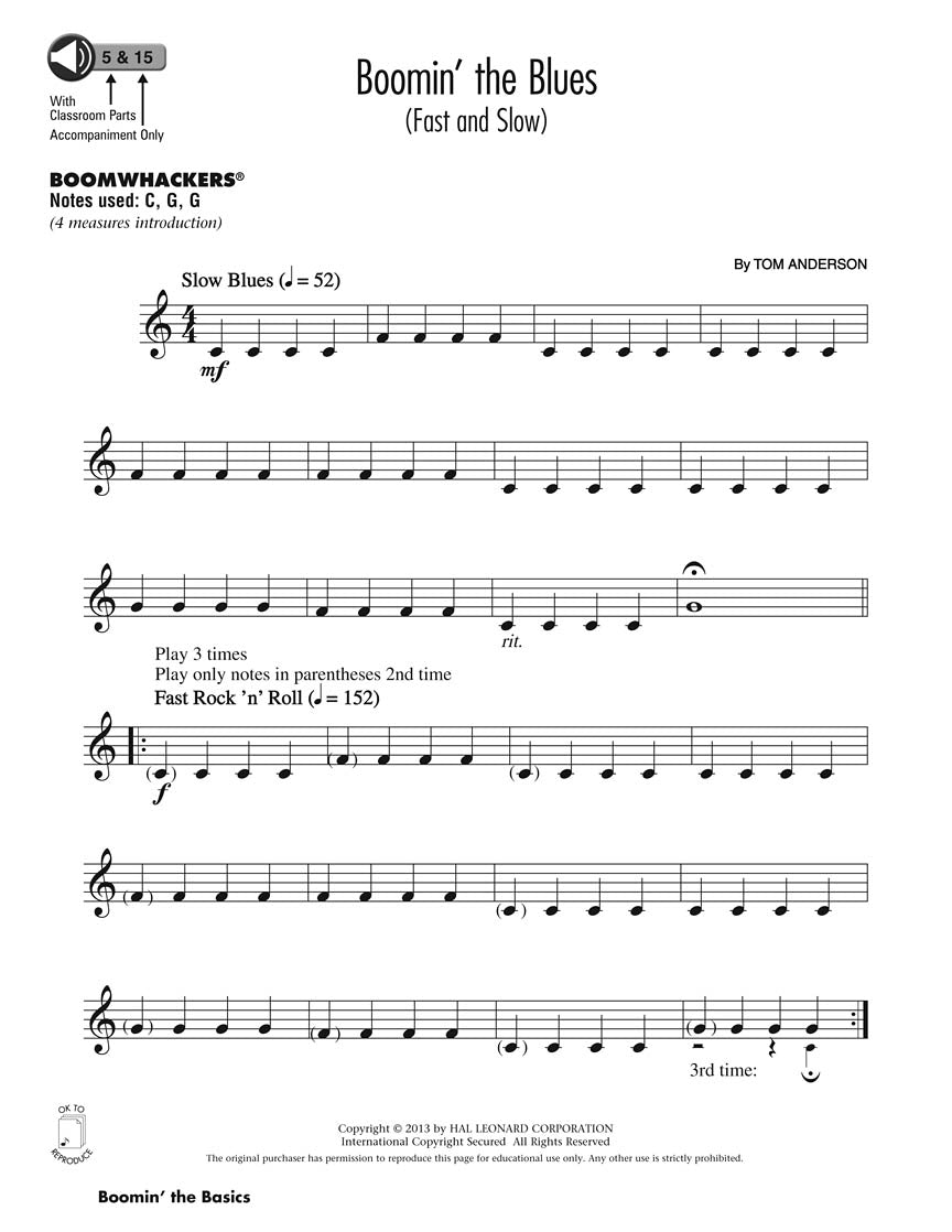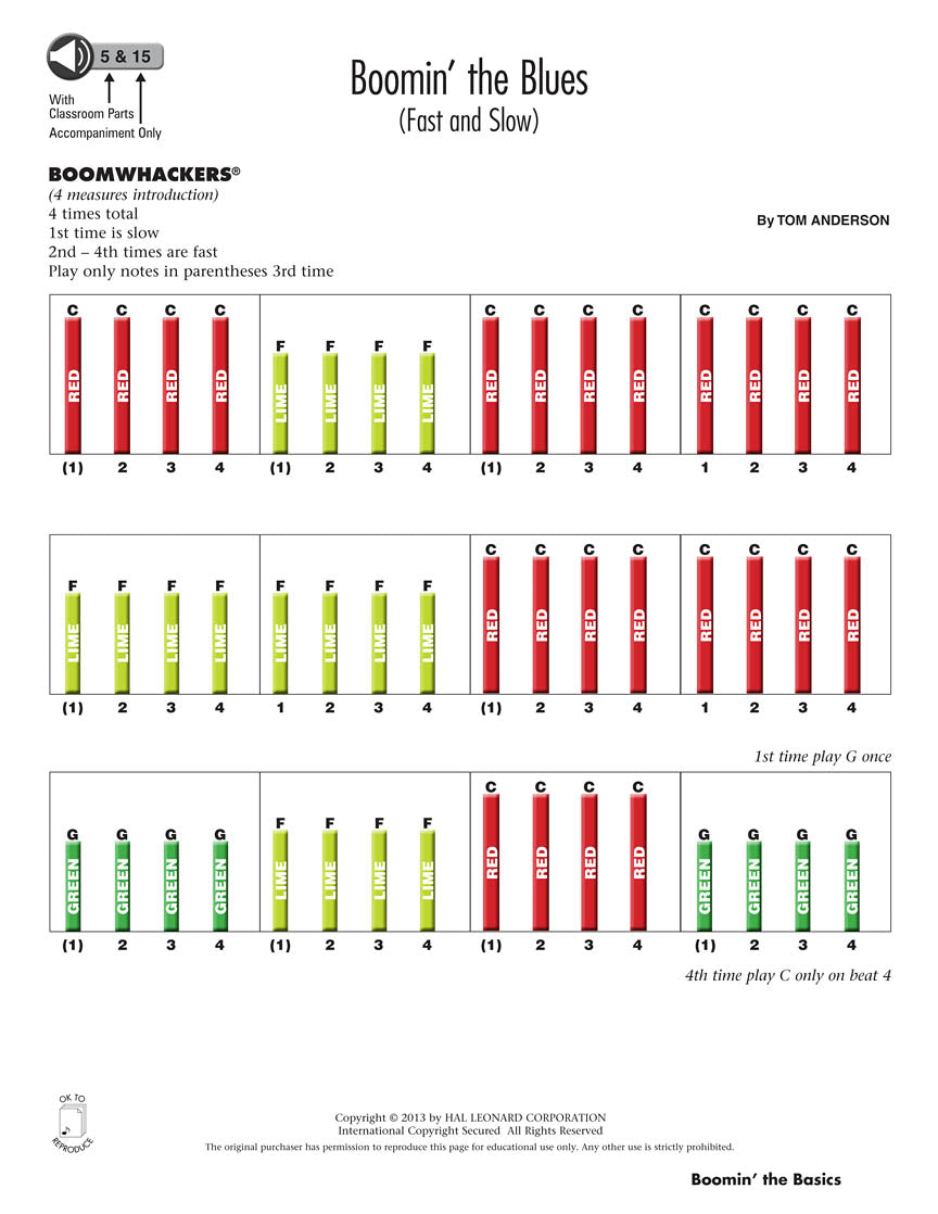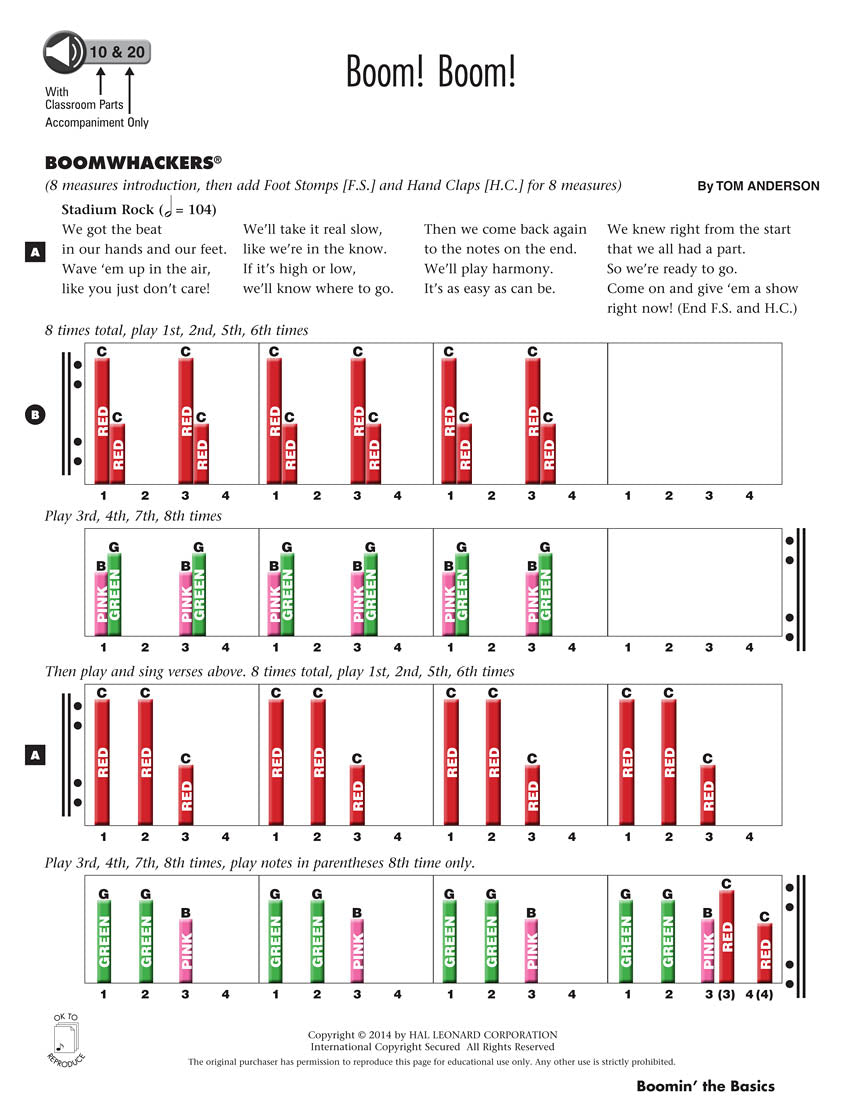 Grab your Boomwhackers® for loads of whacky fun while reinforcing steady beat, high/low, fast/slow and loud/soft! Easy-to-follow read and play instrument parts will keep students actively involved for hours of basic boomin' fun. Beginning readers follow full color song charts of instrument pictures, while more advanced readers play from musical notation. This ten song collection features a variety of musical styles from folk and spirituals to blues, reggae, rock and more! Five of these songs also include vocal parts. All parts are reproducible and projectable! Features DIGITAL ACCESS to audio recordings with and without classroom parts, and PDFs of the instrument and vocal parts for a variety of classroom and performance options. All you need is a C Major Diatonic Scale set of Boomwhackers¨ and a few classroom instruments and you're ready to go! Your students will love boomin' the basics all year long! Suggested for Grades K-5.