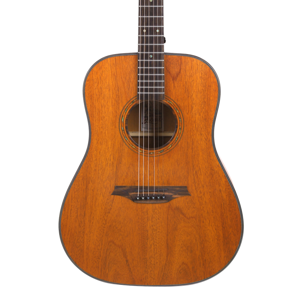 The BAT1M Dreadnought Acoustic Guitar has a solid Mahogany top, neck, back, and sides, and Amara Ebony fingerboard. Natural satin finish.