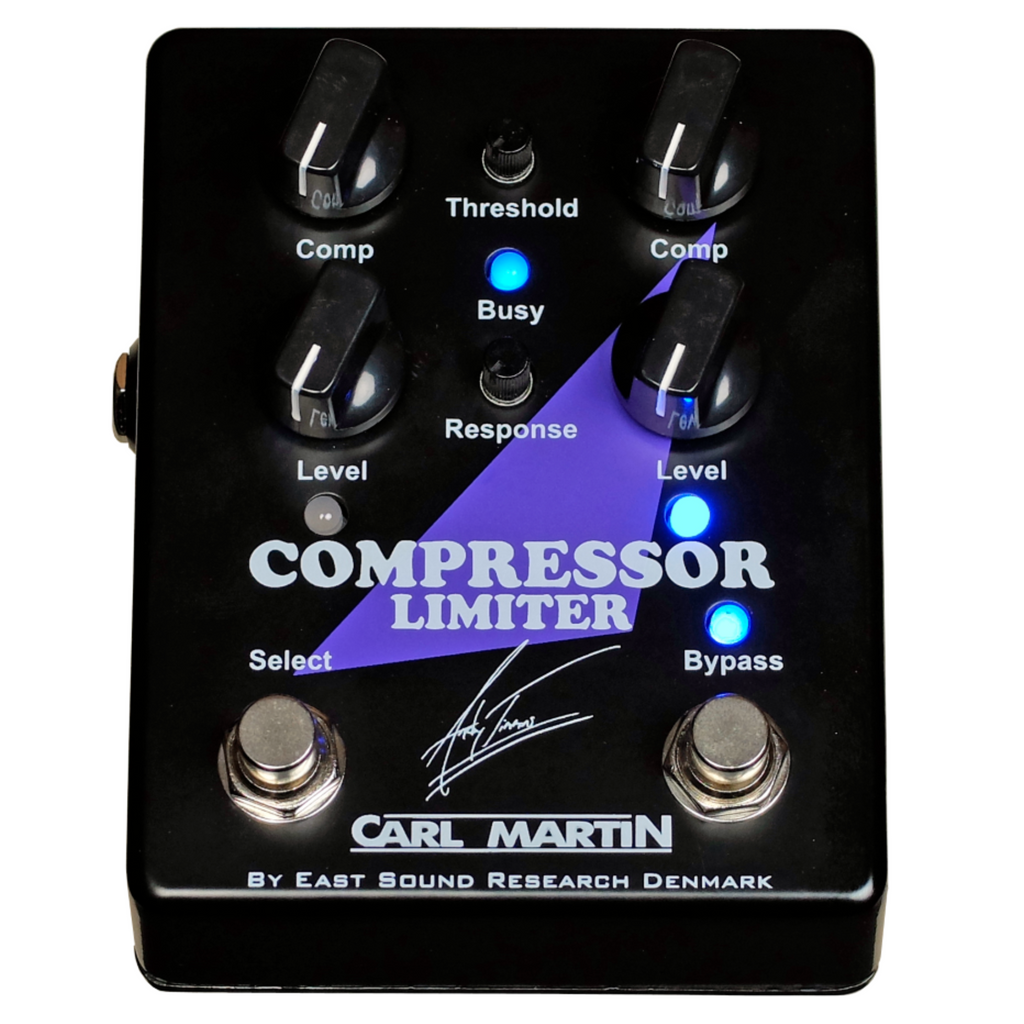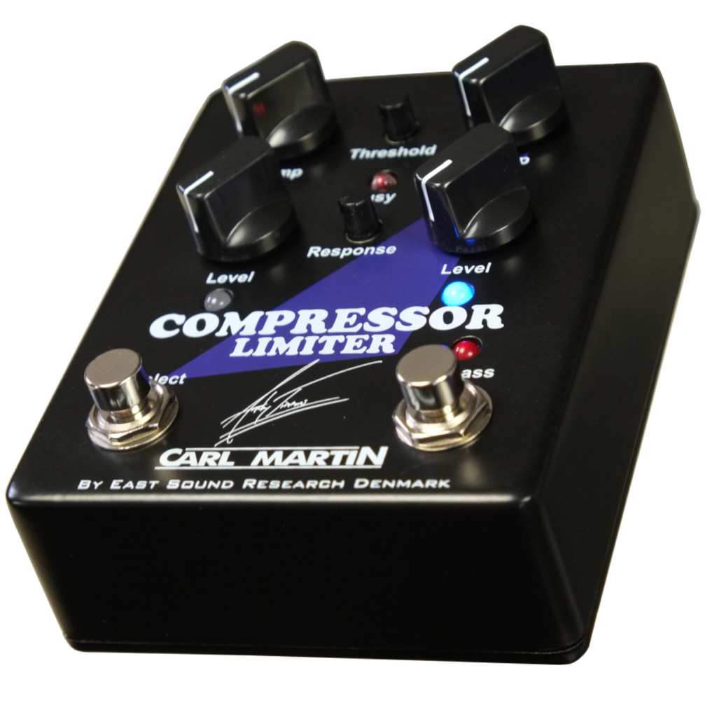 Andy Timmons, long-time user and fan of the Carl Martin Compressor/Limiter, suggested to Carl to create a Compressor/Limiter with two presets, so that he had a preset for more subtle rhythm parts, and a preset with more hard compression and sustain for other parts as solos without having to take up real-estate on the board for two Compressor/Limiters. The result is a two-preset option for Compression Rate and Level. In order to save knobs and to be as user-friendly as possible, the Threshold and Response settings are fixed for both presets, leaving the pedal with only six knobs, the Threshold and Response being 6mm miniature knobs.