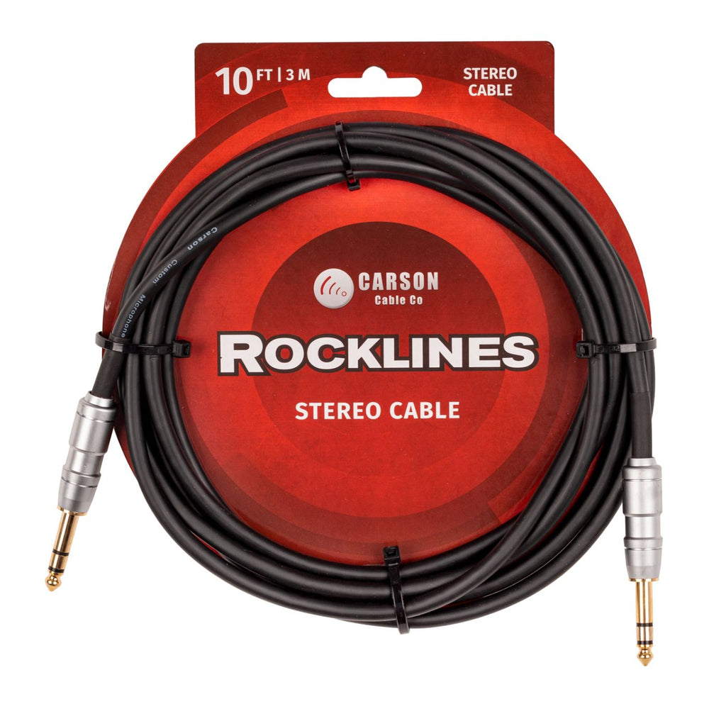 Carson Rocklines. Stereo instrument/audio cable. 6.8mm O/D with heavy duty straight satin chrome 6.3 stereo to 6.3 stereo jacks (M) with gold shafts. Black.