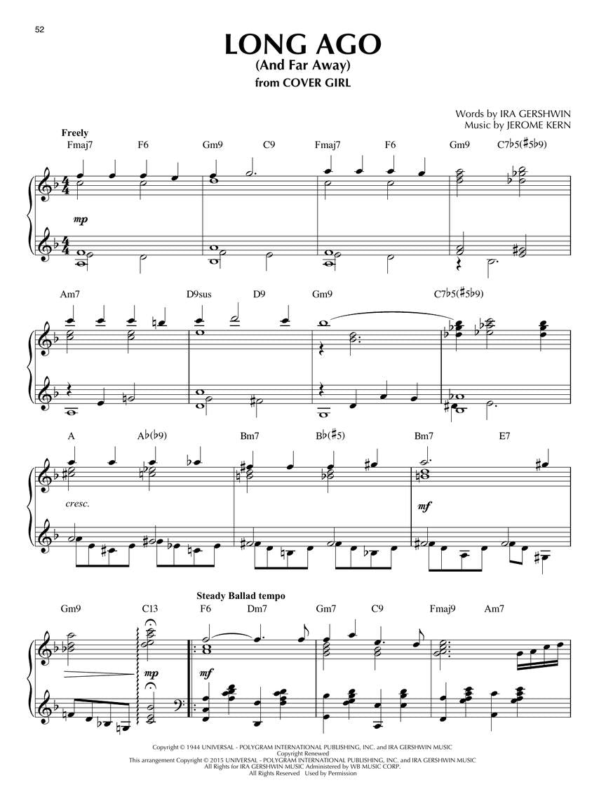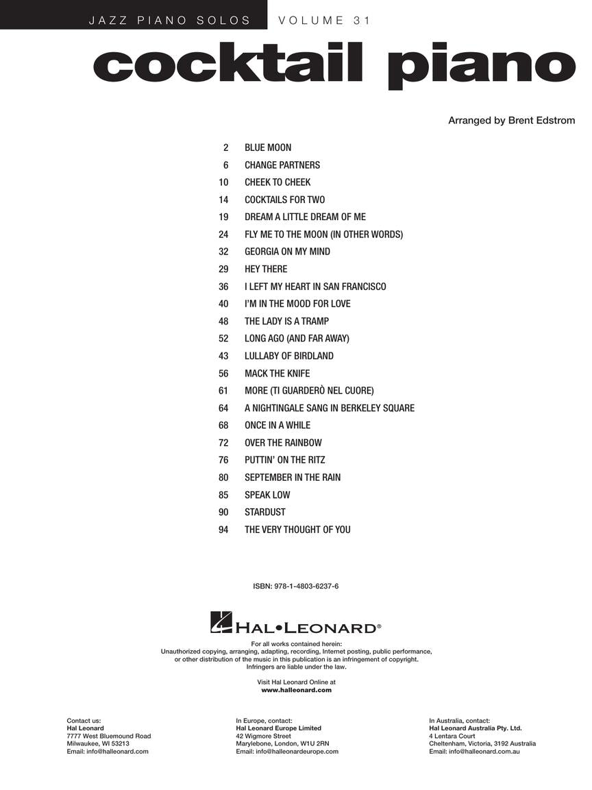 Cool, jazzy arrangements of 23 most-requested standards at the piano lounge, including: Blue Moon • Cocktails for Two • Dream a Little Dream of Me • Fly Me to the Moon (In Other Words) • Georgia on My Mind • Hey There • I Left My Heart in San Francisco • I'm in the Mood for Love • The Lady Is a Tramp • Lullaby of Birdland • Mack the Knife • More (Ti Guarderò Nel Cuore) • Over the Rainbow • Puttin' on the Ritz • Speak Low • The Very Thought of You • and more.
