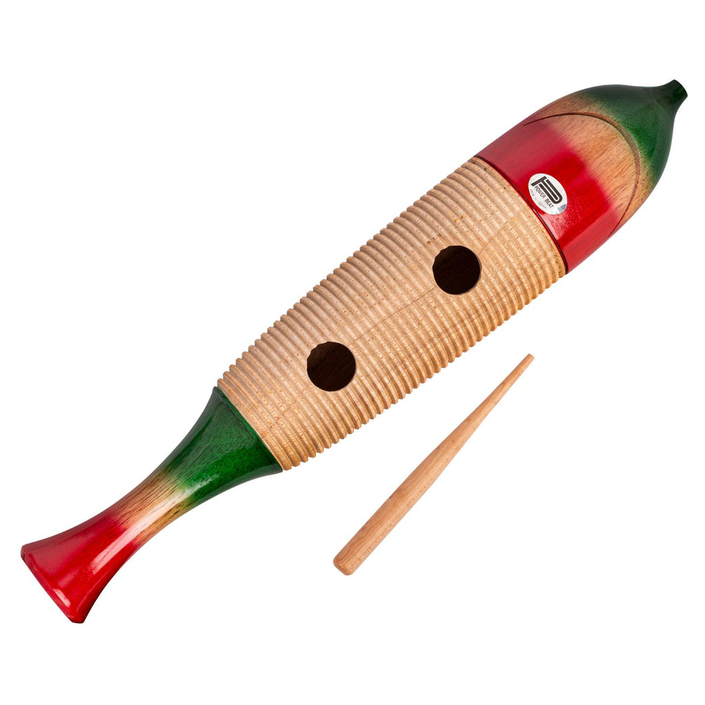 Multi-coloured select wood shell guiro. Large fish shape cylindrical tapered shell with red, natural and green coloured ends. Hand painted. 16" long, 3" diameter. 6¾" ribbed playing area with two finger holes. Complete with steel scraper. Taiwanese.