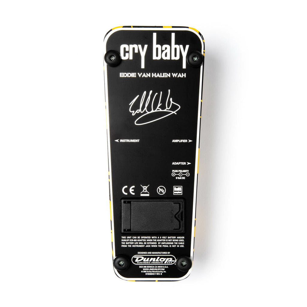 The EVH Wah was developed after intensive design collaboration with the legendary guitarist, Eddie Van Halen. Early on in the process, Eddie handed over his “Holy Grail” Cry Baby Wah—a standard Cry Baby customized in the early Nineties with a more vocal-like, High Q inductor and a wider frequency sweep. Amazingly, we found that over the years Eddie’s unique wah style, which uses mostly the middle range of the pedal’s action, had carved his own curve into the pot’s resistive element, making the middle range even more defined and increased the low-end sweep. Our clones of the worn-in pot and hand-selected inductor give the new EVH Wah Wah the same “Holy Grail” feel and tone, and its true hardwire bypass, dual bright blue bypass LEDs, and graphics based on the black and yellow-striped guitar featured on Van Halen II round out this EVH-approved Cry Baby with a voice and look all its own.