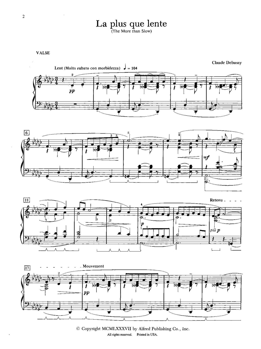 "The More than Slow Waltz" is one way to translate this interesting Debussy work. The composer was apparently fascinated by the waltz form for many reasons, and this particular work represented a reaction to the wide-spread influence of the slow waltz in France's social gathering places. It is written in G-flat major.