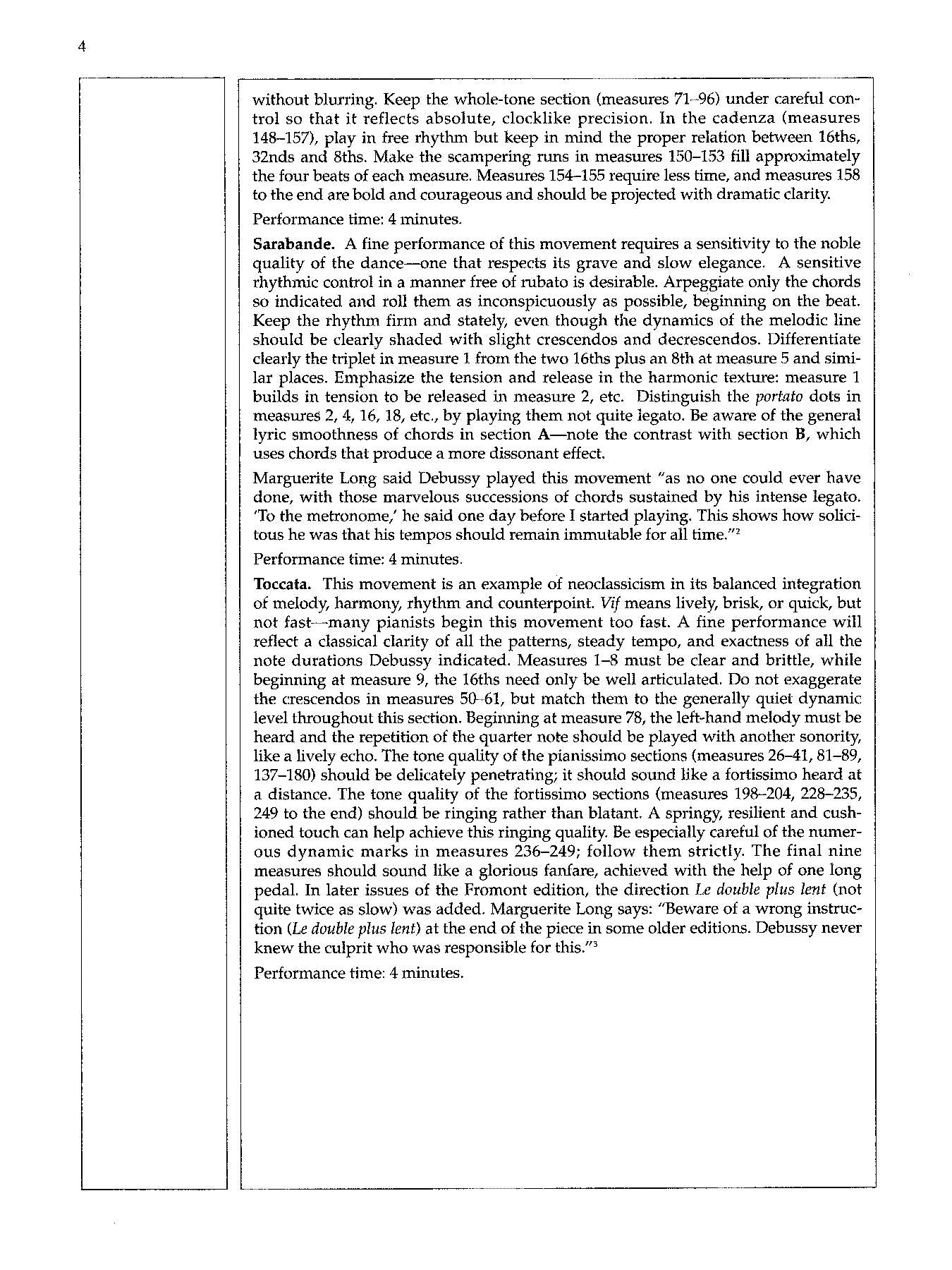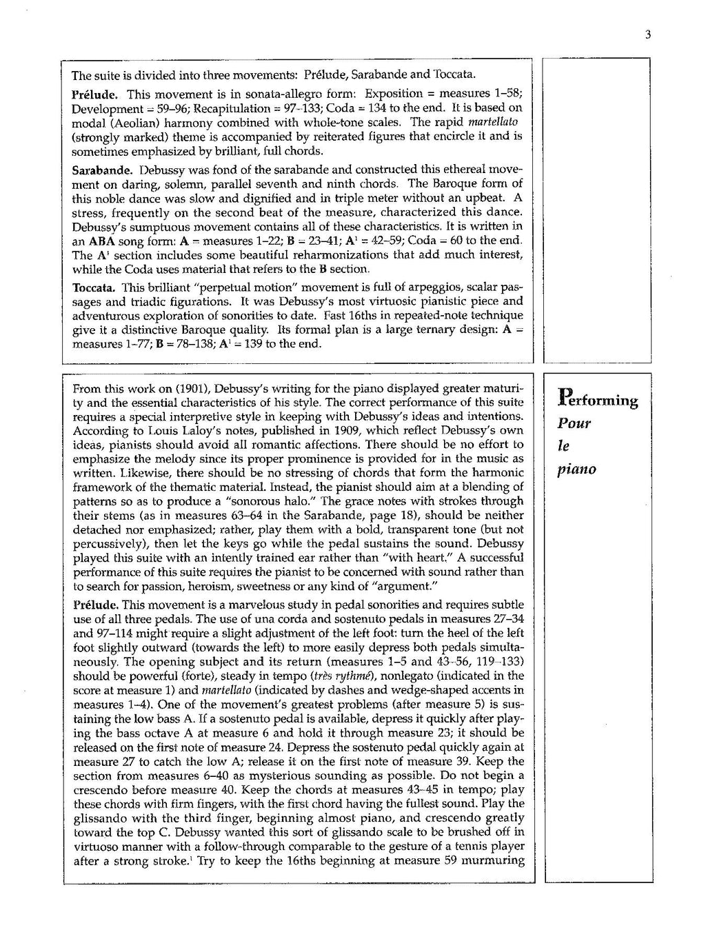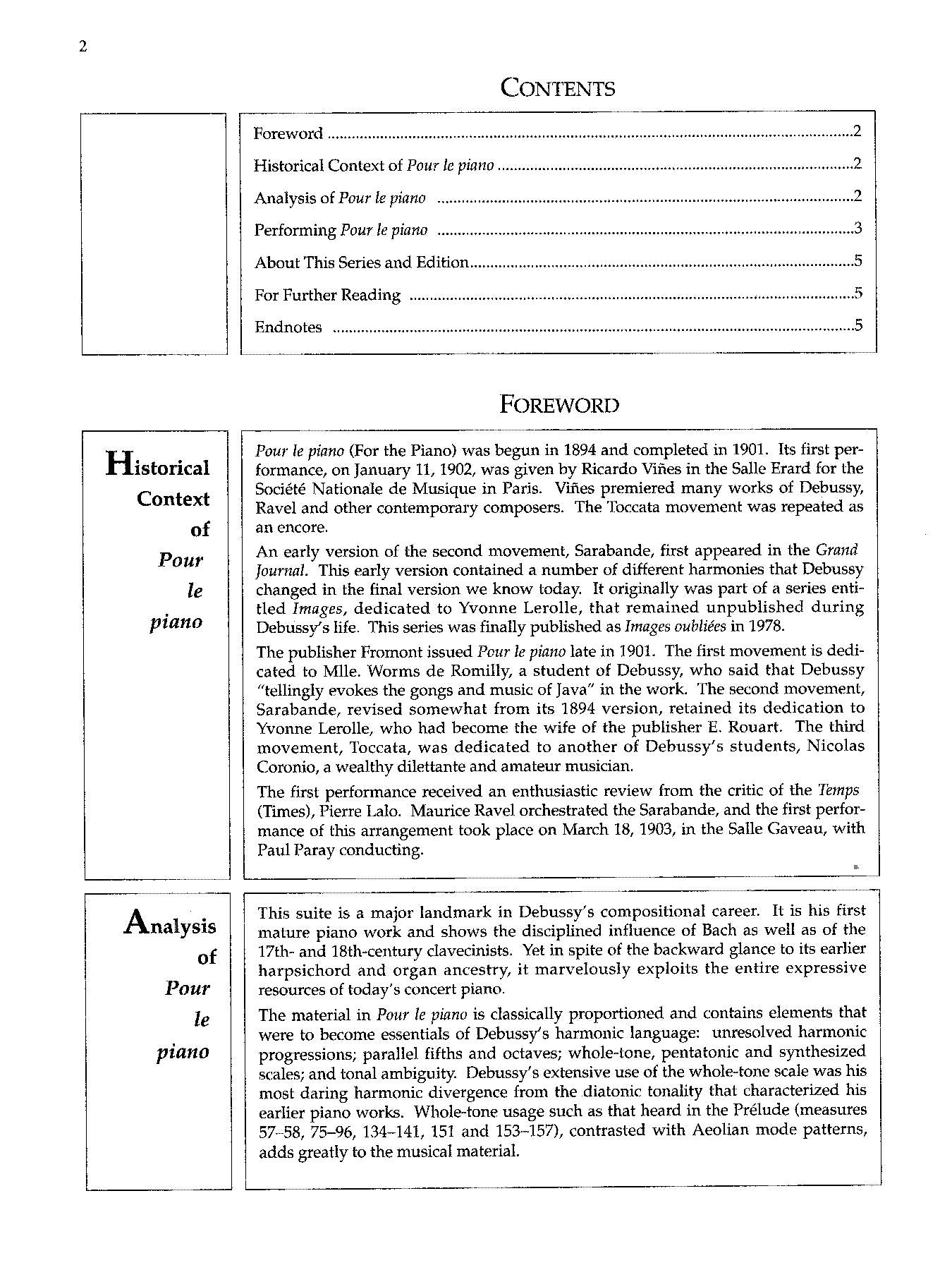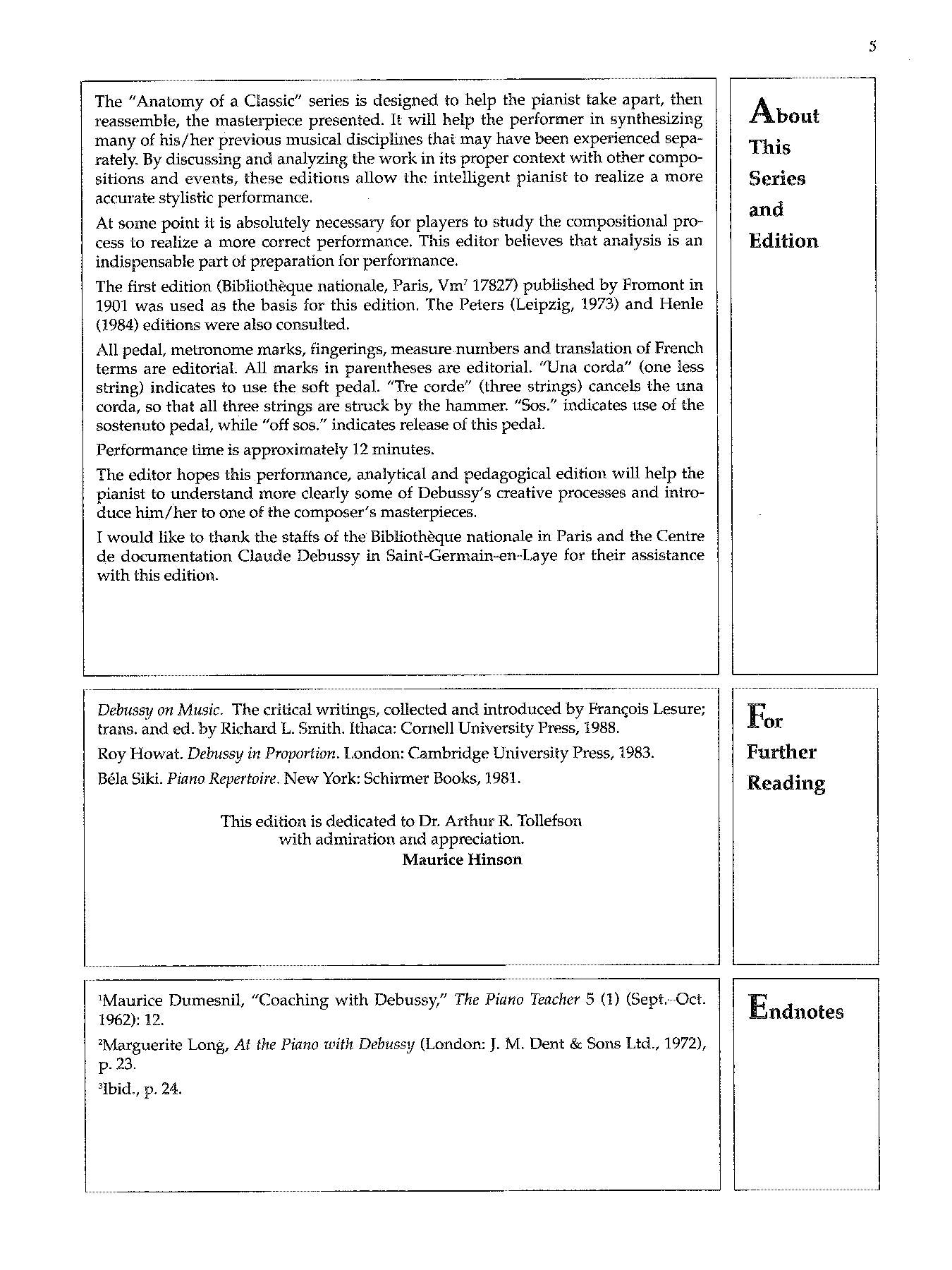 This analytical and pedagogical edition by Maurice Hinson will give the pianist a clearer understanding of Debussy's creative processes as well as an educated introduction to one of the composer's masterpieces. Pedal and metronome markings are editorial, and Dr. Hinson has consulted the Peters, Henle and Bibliothèque national, Paris, editions.