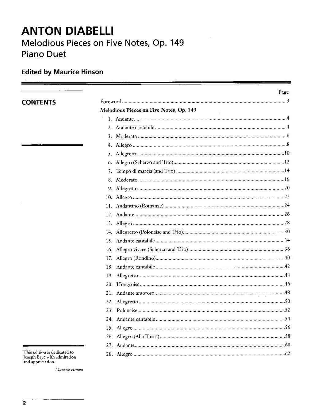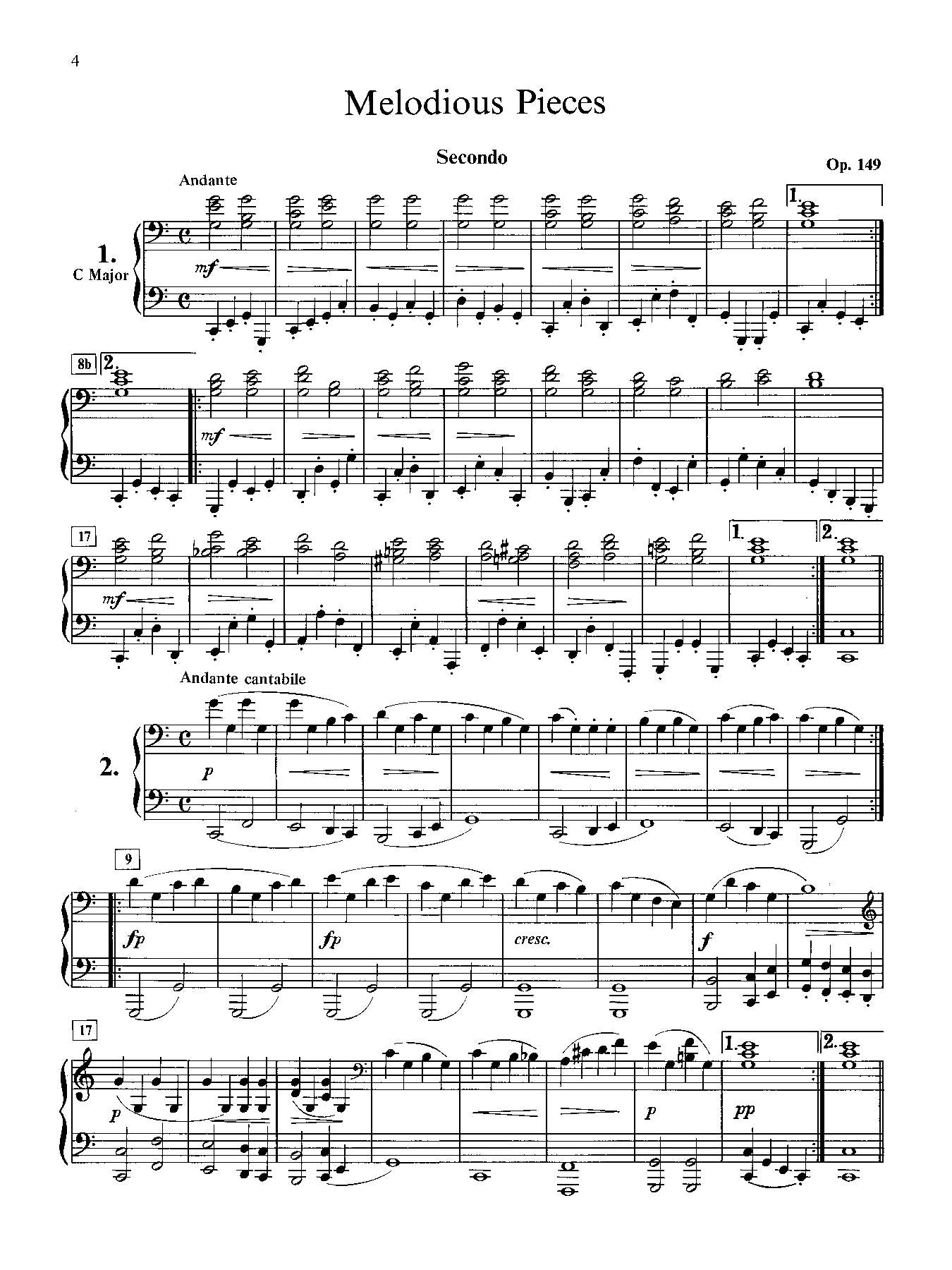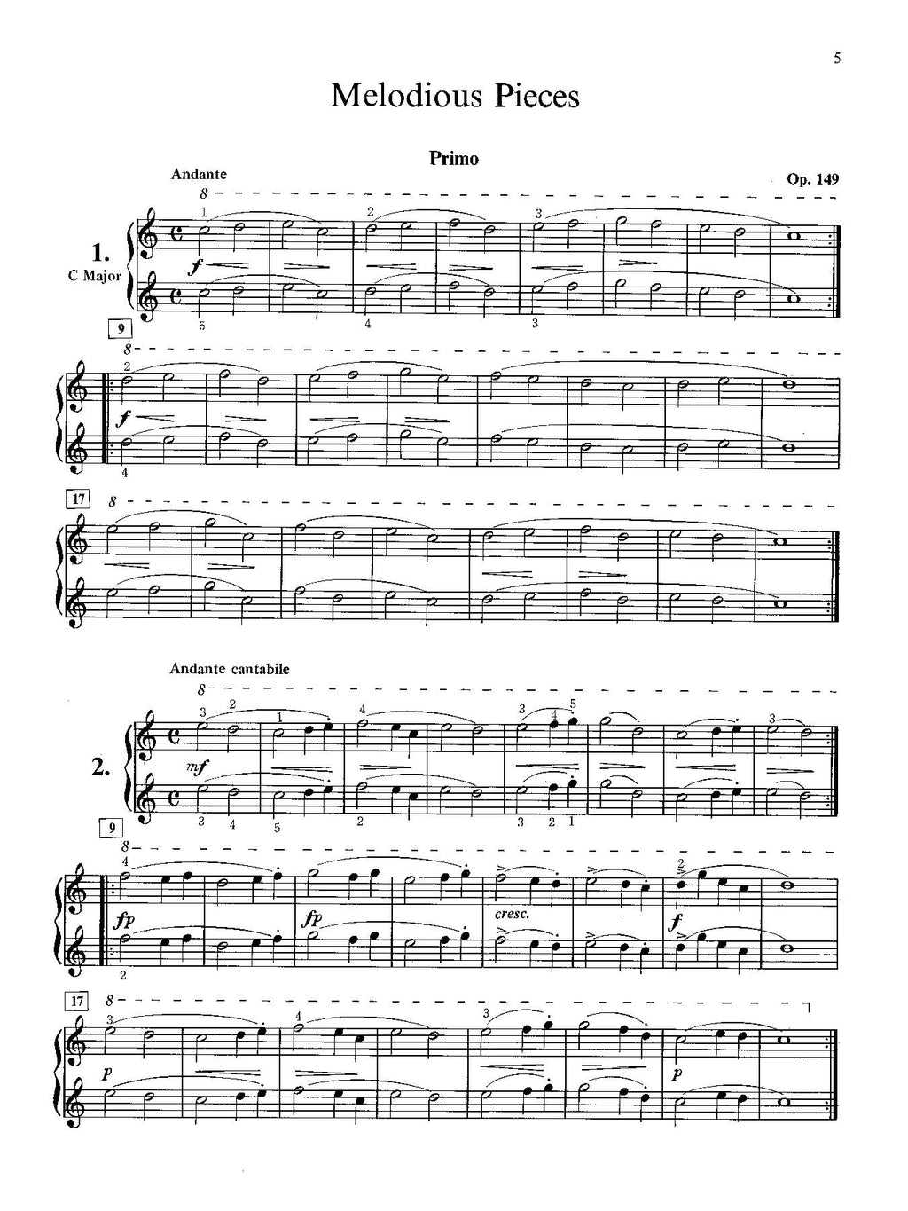 An attractive collection of 28 duets in which both hands of the primo part remain in set five-finger positions. Secondo parts are appropriate for more advanced students of the teacher. The keys employed are limited to those three sharps and flats.