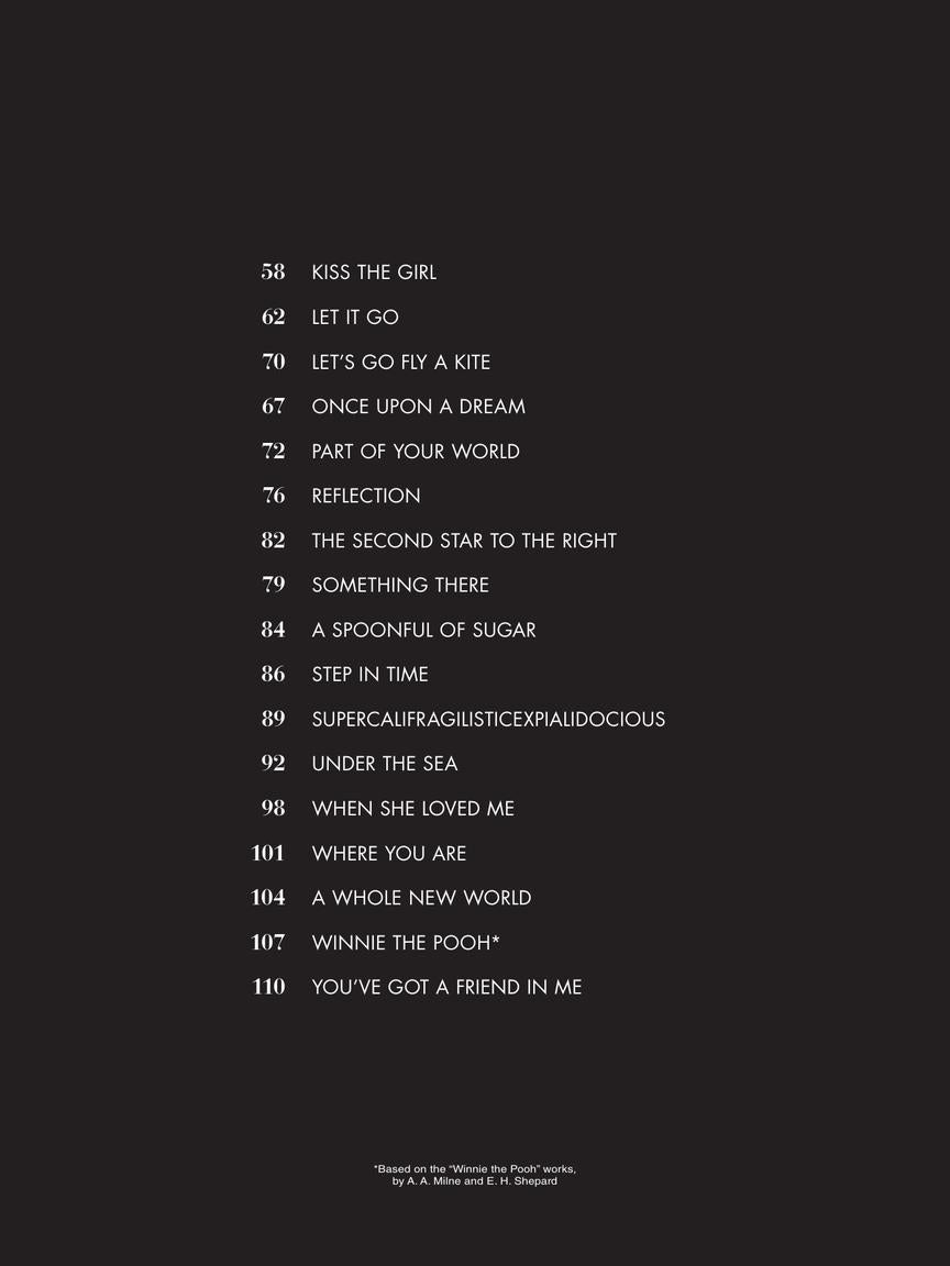 Relax at the piano with soft and gentle arrangements of 34 Disney favorites for piano as heard on their popular recordings. Songs include: Beauty and the Beast • Can You Feel the Love Tonight • Colors of the Wind • A Dream Is a Wish Your Heart Makes • For the First Time in Forever • Go the Distance • How Far I'll Go • I See the Light • It's a Small World • Let It Go • Part of Your World • Reflection • When She Loved Me • A Whole New World • and more.