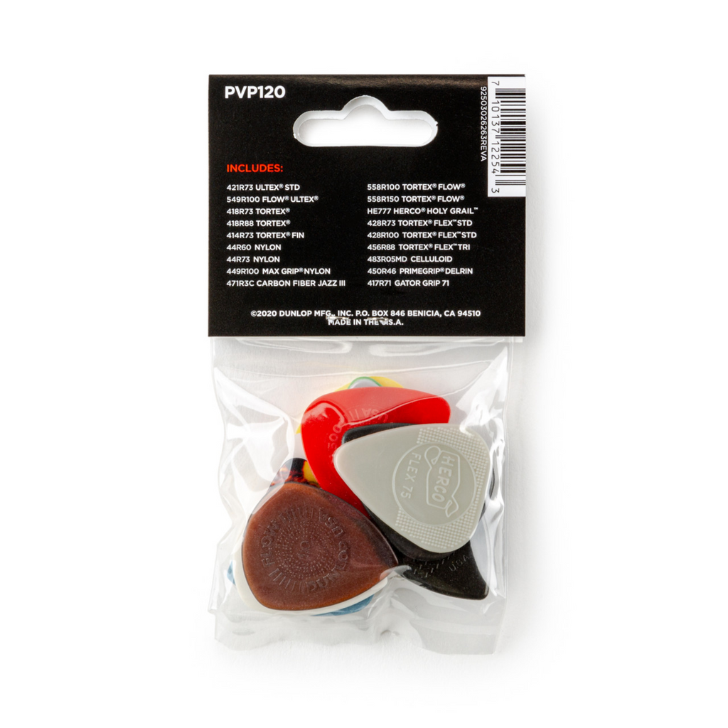Includes 1 each of the following for a total of 18 Dunlop Picks: Ultex Standard Pick .73mm, Flow Ultex Pick 1.0mm, Tortex Standard Pick .73mm, Tortex Standard Pick .88mm, Tortex Fin Pick .73mm, Nylon Standard Pick .60mm, Nylon Standard Pick .73mm, Max-Grip Nylon Pick 1.0mm, Carbon Fiber Jazz III Pick, Tortex Flow Pick 1.0mm, Tortex Flow Pick 1.5mm, Herco Holy Grail Pick, Tortex Flex Standard Pick .73mm, Tortex Flex Standard Pick 1.0mm, Tortex Flex Tri Pick .88mm, Celluloid Pick Medium, Primegrip Delrin Pick .46mm, and Gator Grip Pick .71mm.