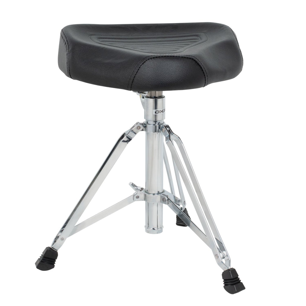 Very heavy duty stool. Well padded "saddle style" seat. Wide angle double braced legs. Chrome. Worm screw height adjustable 48cm to 63cm. Seat diameter 36cm, depth 9cm.