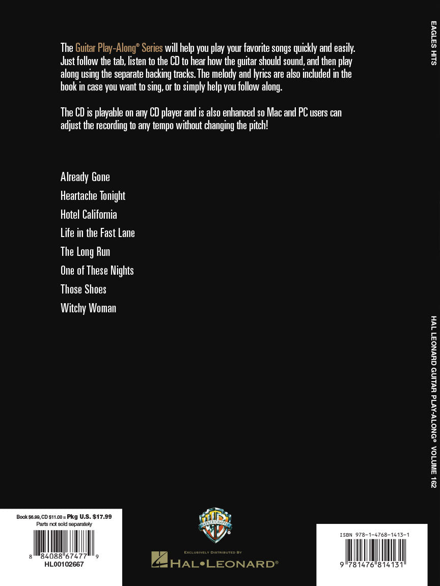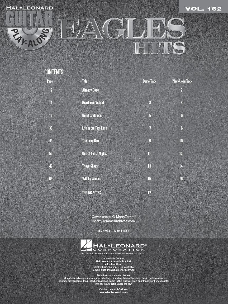 The Guitar Play-Along Series will help you play your favorite songs quickly and easily! Just follow the tab, listen to the audio tracks to hear how the guitar should sound, and then play along using the separate backing tracks. The melody and lyrics are also included in the book in case you want to sing, or to simply help you follow along. The online audio is accessed using the unique code included in the book. 8 songs: Already Gone • Heartache Tonight • Hotel California • Life in the Fast Lane • The Long Run • One of These Nights • Those Shoes • Witchy Woman.
