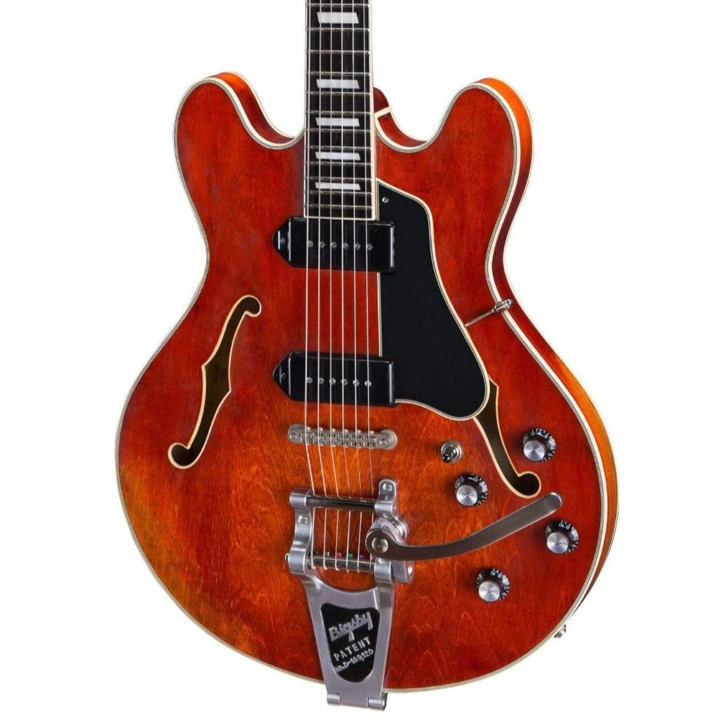 The Eastman Guitars T64/Vintage Bigsby Antique Classic Vintage is light, resonate and gorgeous warm tone with the Lollar Dog ear P90s and a spectacular antique varnish finish more commonly seen on violins. A true contender!