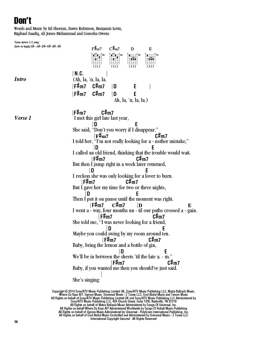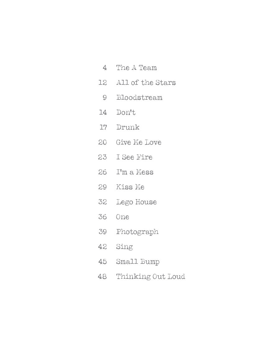 15 songs presented simply with chords and lyrics from this hot singer/songwriter for guitarists to strum and sing: The A Team • All of the Stars • Bloodstream • Don't • Drunk • Give Me Love • I See Fire • I'm a Mess • Kiss Me • Lego House • One • Photograph • Sing • Small Bump • Thinking Out Loud.