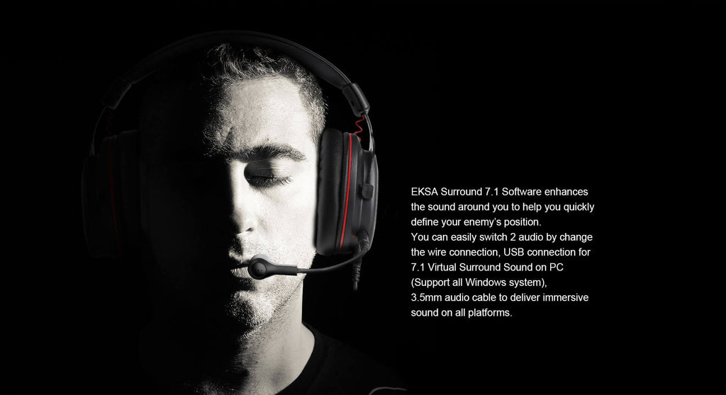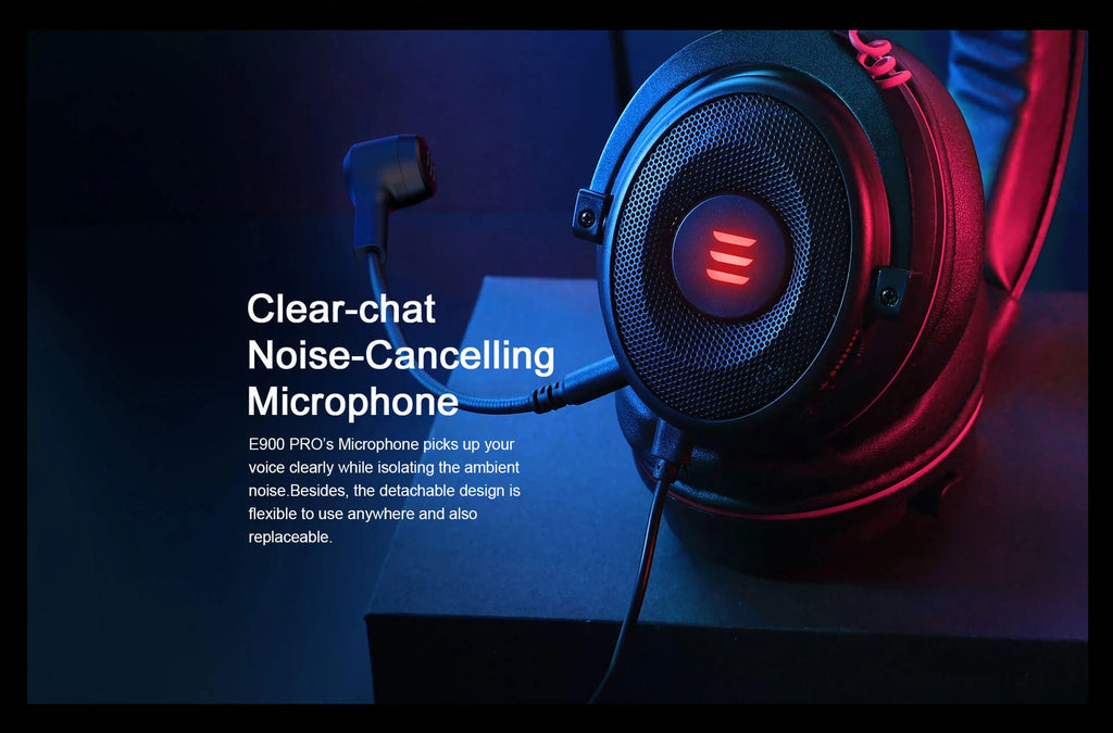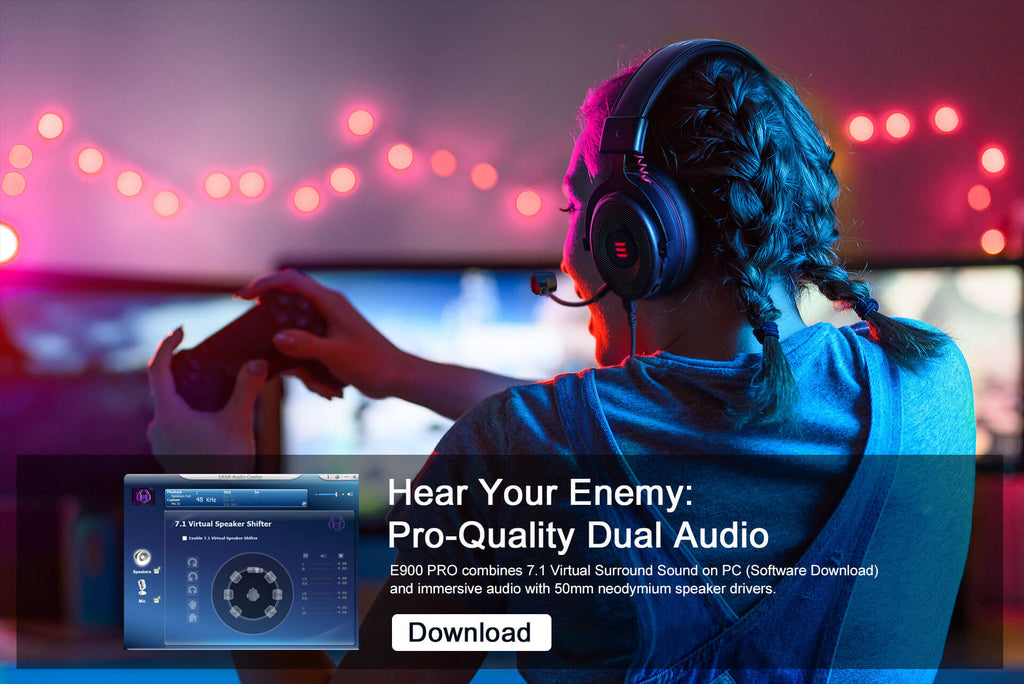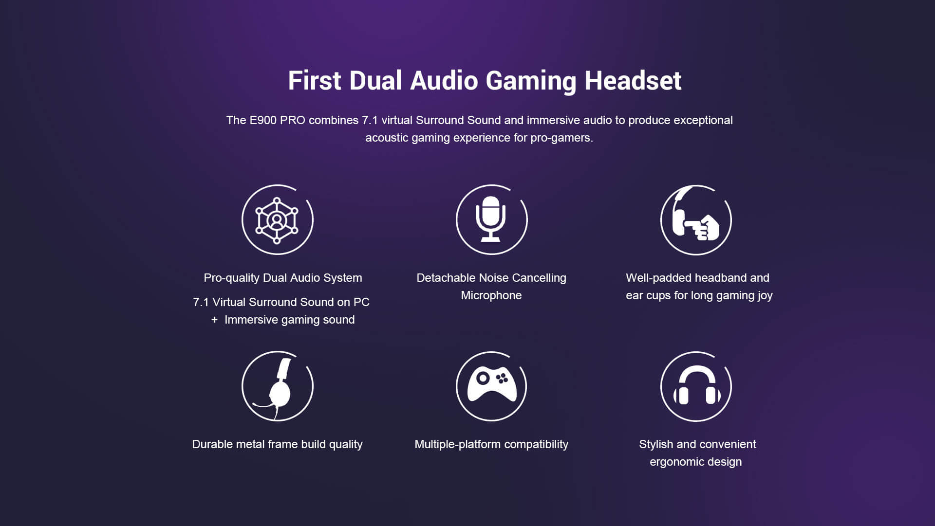 First Dual Audio Gaming Headset The E900 PRO combines 7.1 virtual Surround Sound and immersive audio to produce an exceptional acoustic gaming experience for pro-gamers.