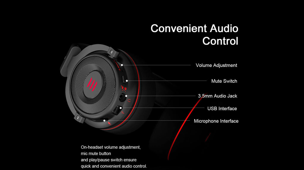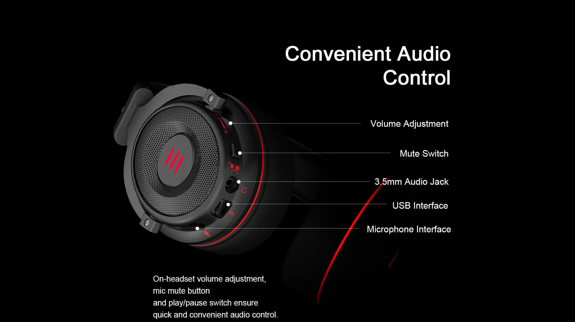 Convenient Audio Control On-headset volume adjustment, mic mute button and play/pause switch ensure quick and convenient audio control.