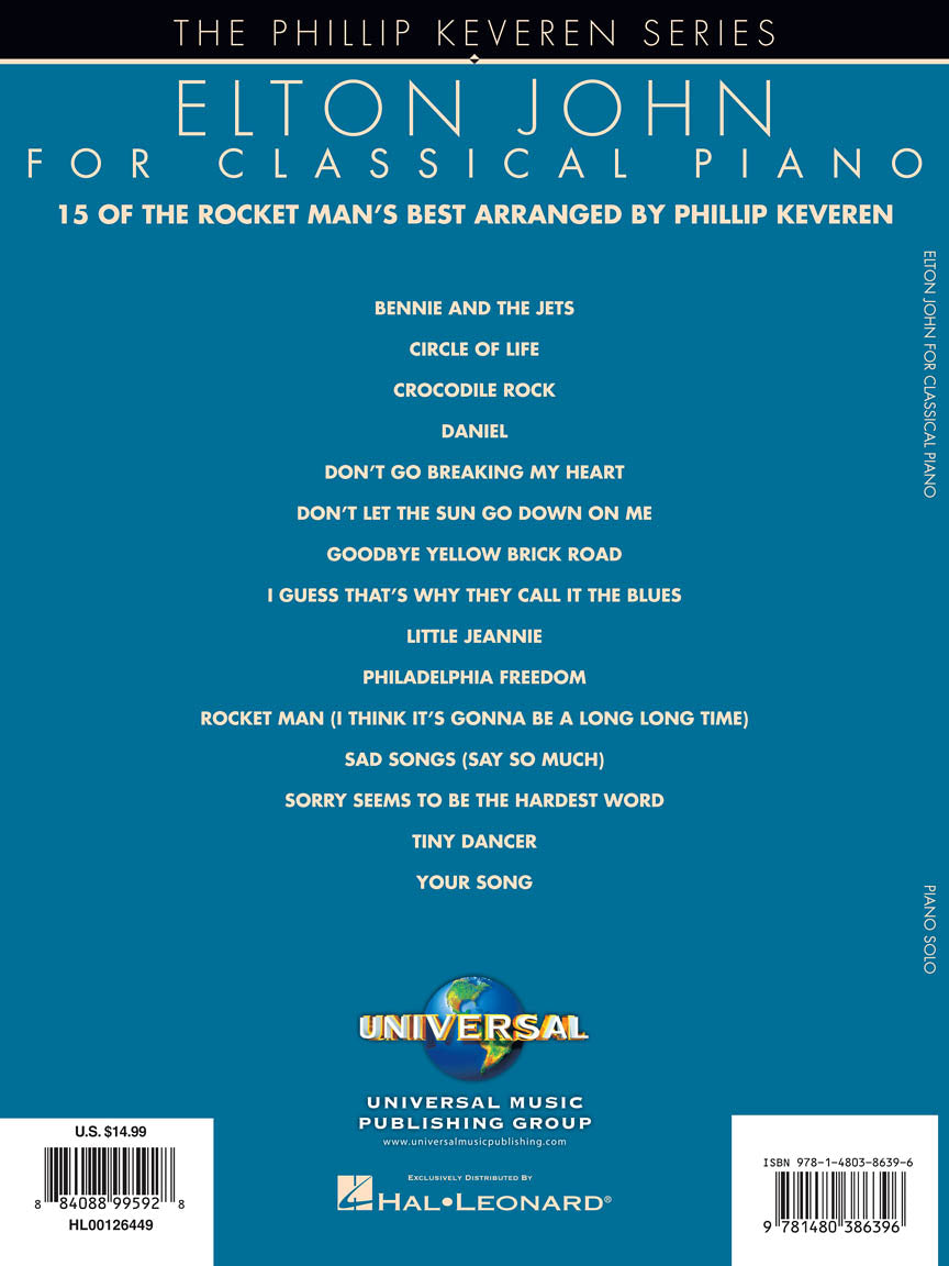15 of the Rocket Man's best artfully arranged by Phillip Keveren for classical piano. Includes: Bennie and the Jets • Circle of Life • Daniel • Goodbye Yellow Brick Road • I Guess That's Why They Call It the Blues • Sad Songs (Say So Much) • Tiny Dancer • Your Song • and more.