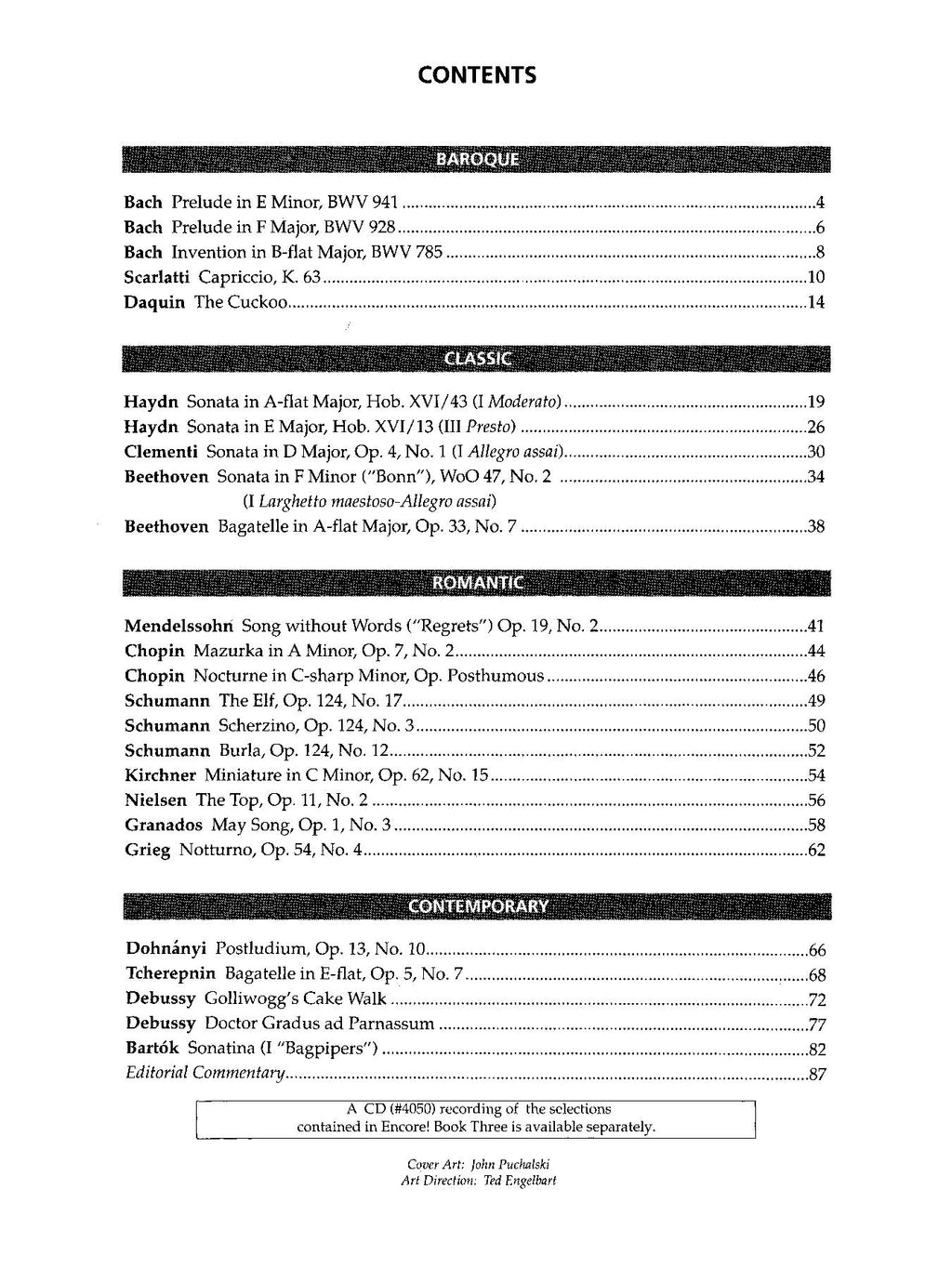 Encore Book 3 contains 25 pieces of early-advanced literature---perfect for students who have completed their method book studies and are preparing to perform more advanced repertoire. Includes music from the Baroque, Classical, Romantic, and Contemporary eras, and editor's commentary.
