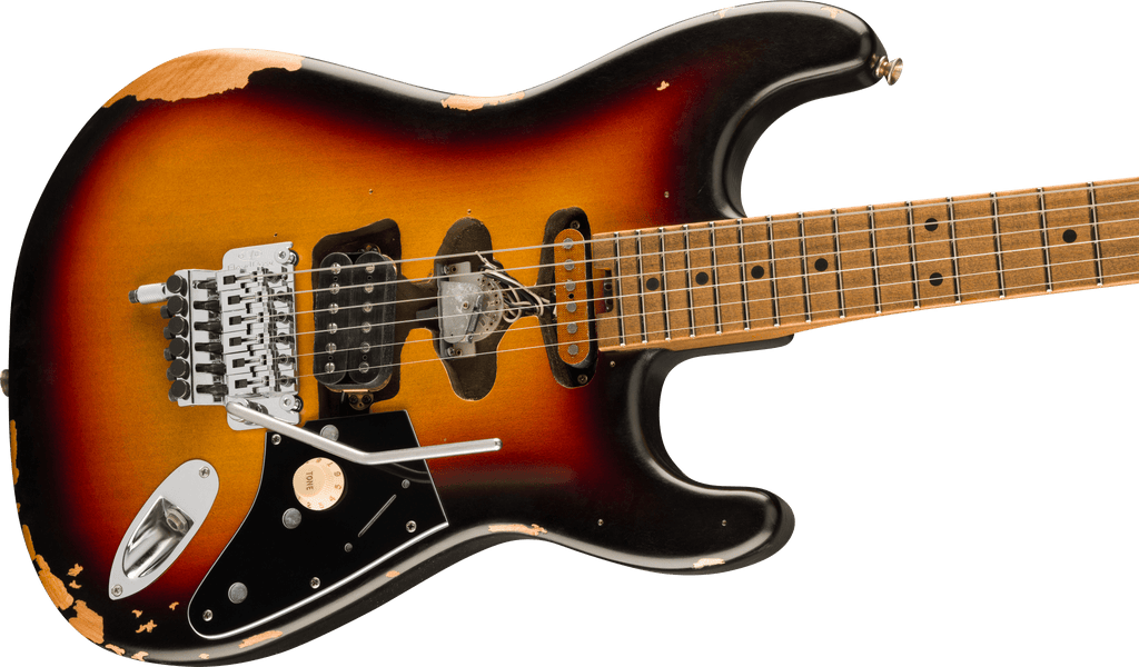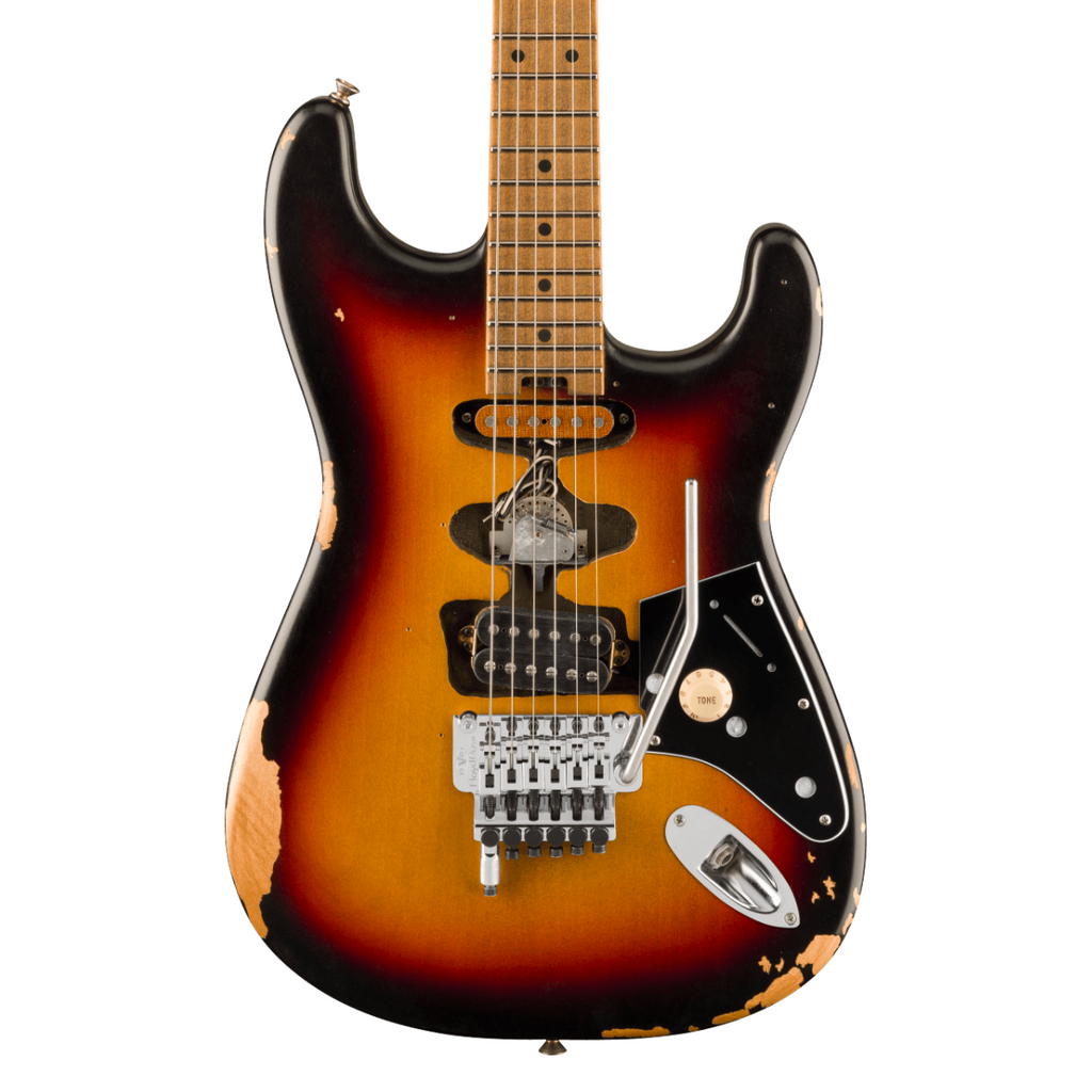 There are very few guitars out there that are as famous as Eddie Van Halen's favorite 6-string sidekick, lovingly known as "Frankenstein." This guitar was Eddie's attempt to combine the sound of a classic single-cut solid body guitar with the physical attributes and tremolo bar functionality of a Fender Stratocaster. The EVH Frankenstein "Frankie" Series is a civilian variant of Eddie Van Halen's iconic red, black, and white Frankenstrat guitar - complete with a worn-in relic'd finish.