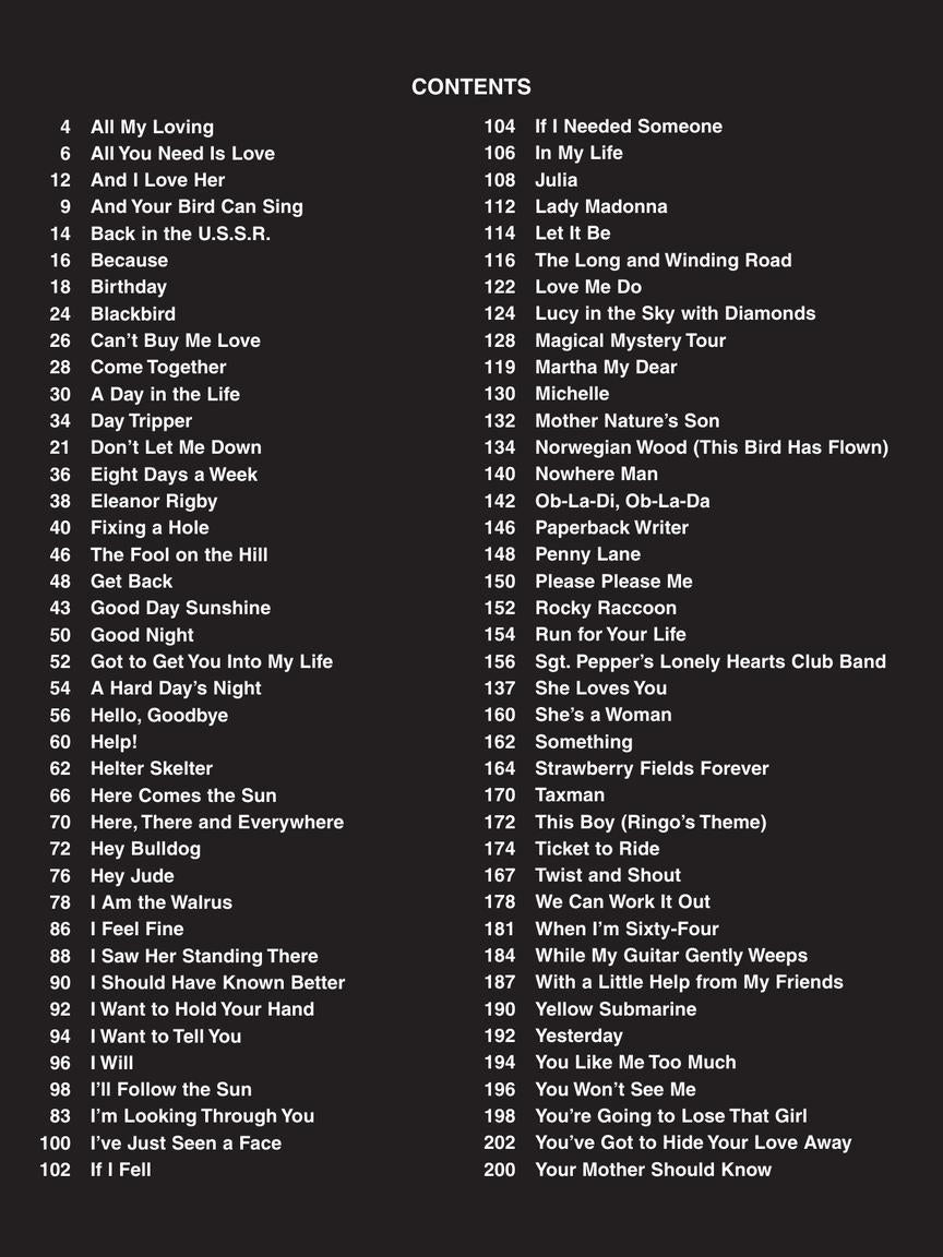 80 of the greatest from the Fab Four, made easy! Includes: All My Loving· Because · Blackbird · Good Day Sunshine · Hello, Goodbye · Hey Jude · If I Fell · Let It Be · Michelle · Norwegian Wood · Penny Lane · Something · Taxman · Yesterday · scores more!